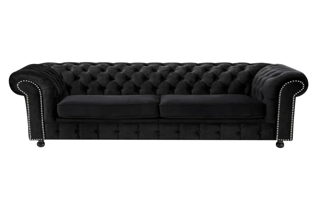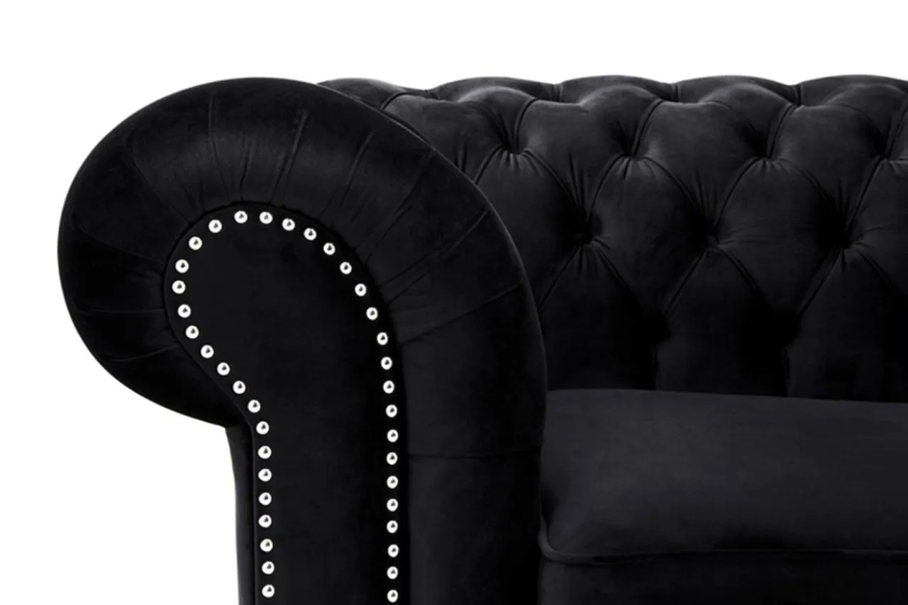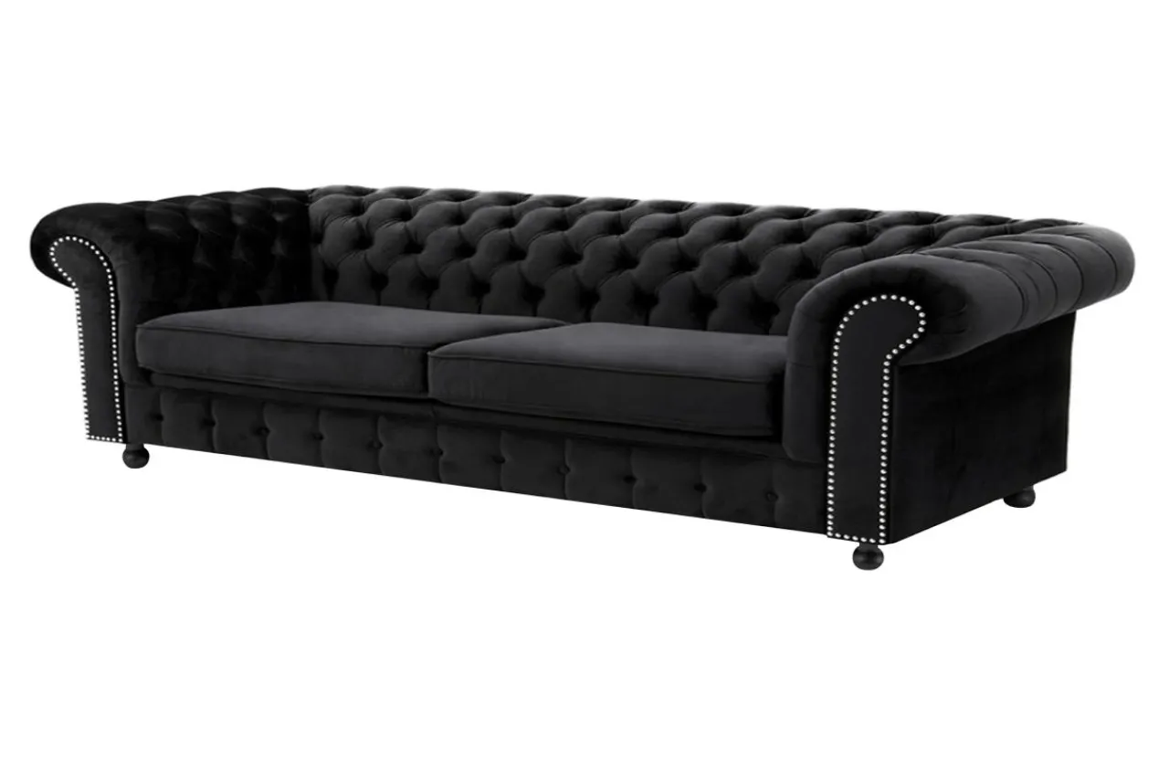 - Sofę CHESTER charakteryzuje pikowanie na oparciu oraz srebrne ćwieki zdobiące front podłokietników.