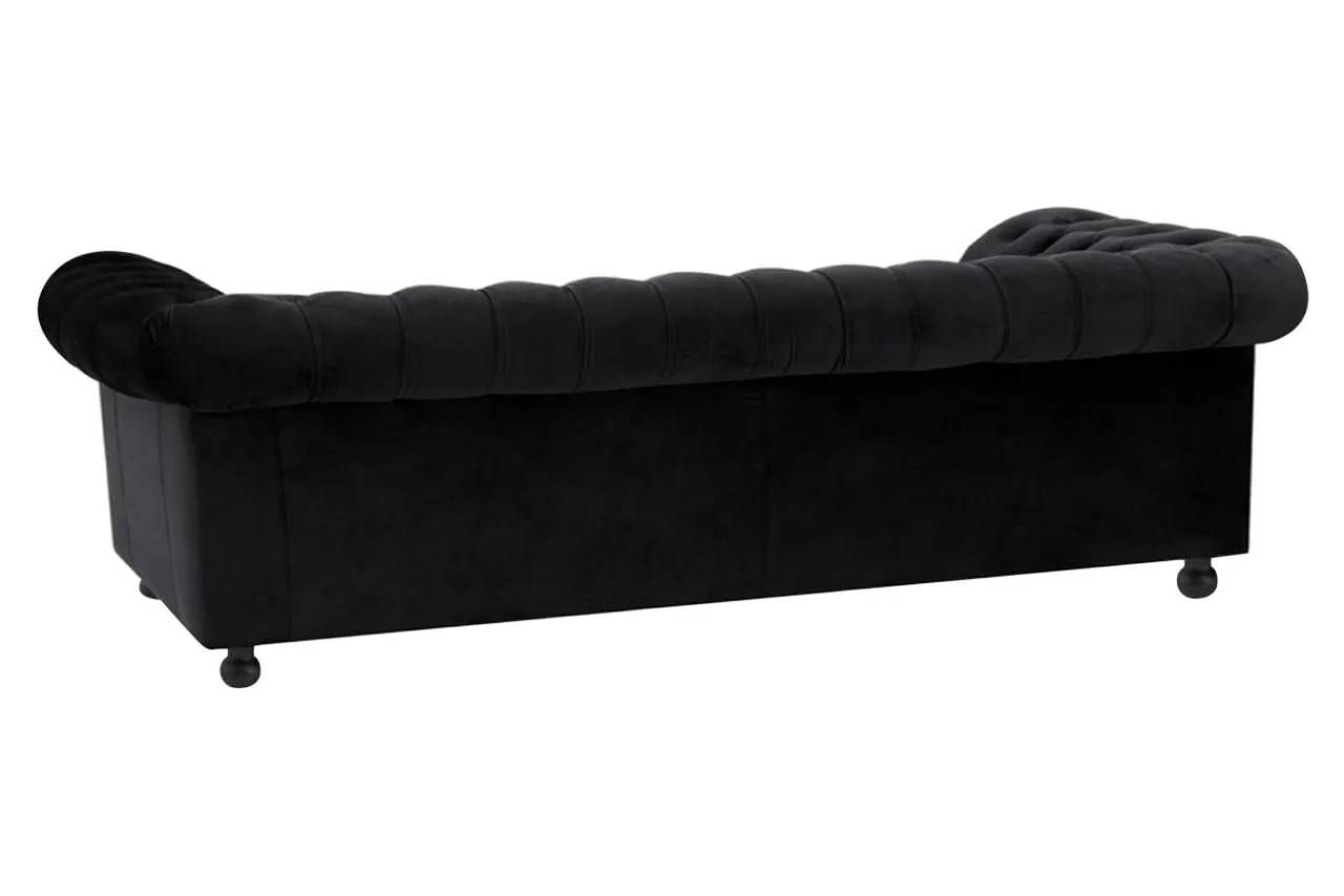 - Czarny welurowy materiał oraz drewniane nóżki w kształcie kul dodają jej elegancji.