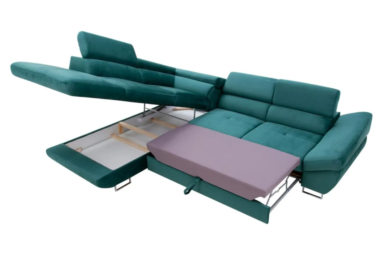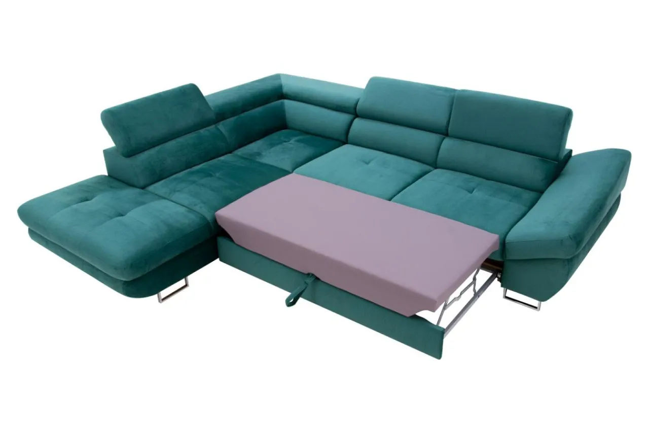 Narożnik możesz rozłożyć bez konieczności odsuwania go od ściany. Wystarczy wysunąć element spod siedziska, by stworzyć przestrzeń do przenocowania gościa.