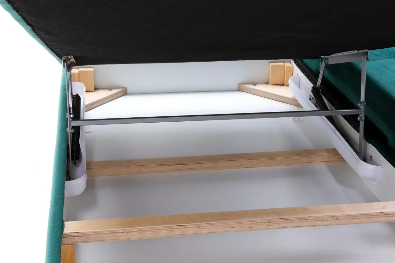 Stelaż pod siedziskiem wysuwamy i podnosimy za pomocą uchwytu. Mebel nie wymaga odsuwania od ściany. Idealny do okazjonalnego spania.