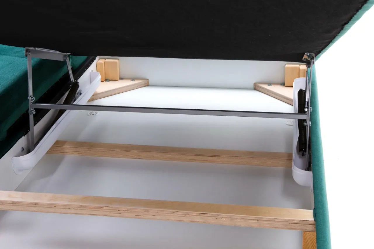 Pojemnik na pościel znajduje się w bocznej części mebla – otomanie.