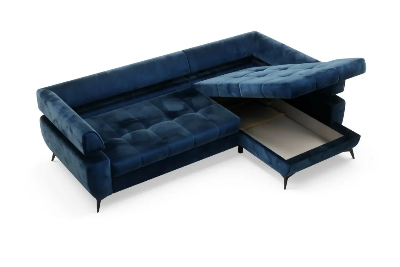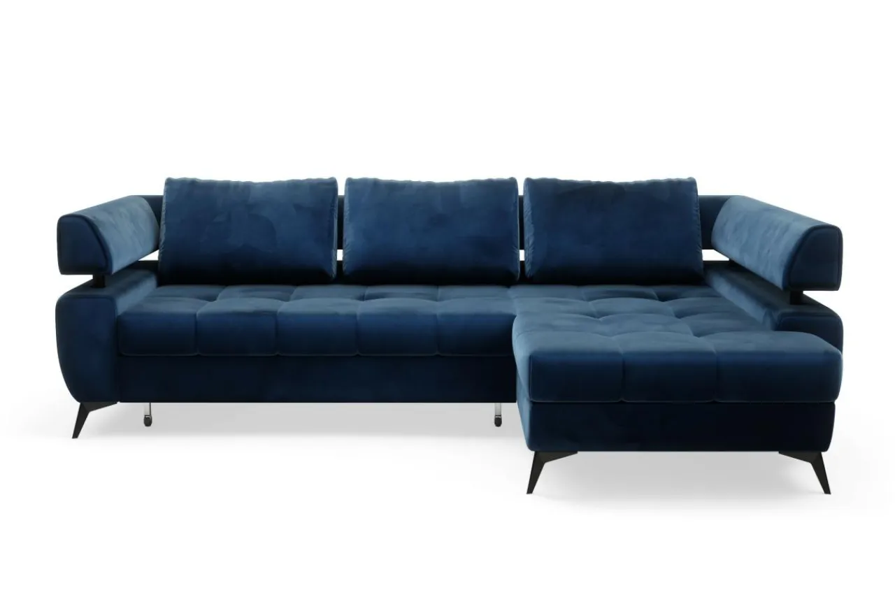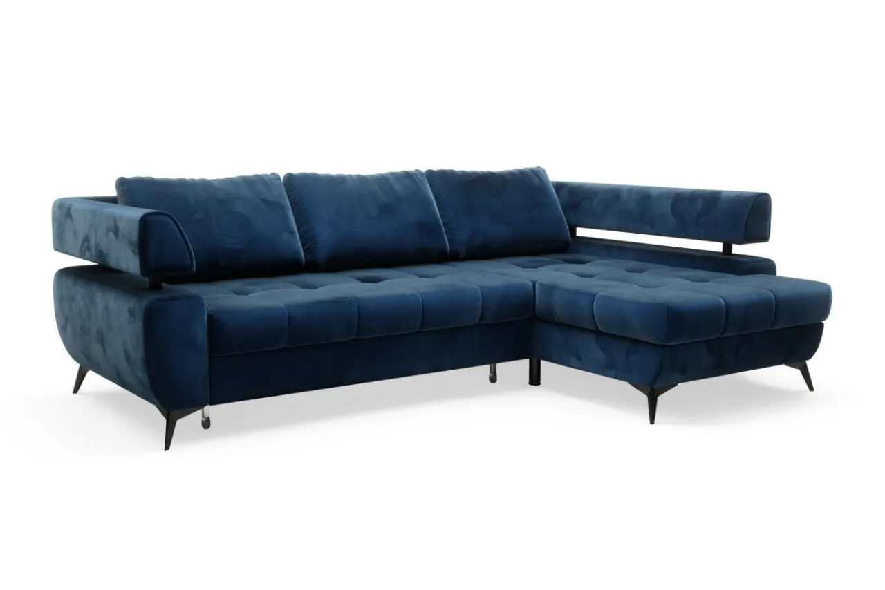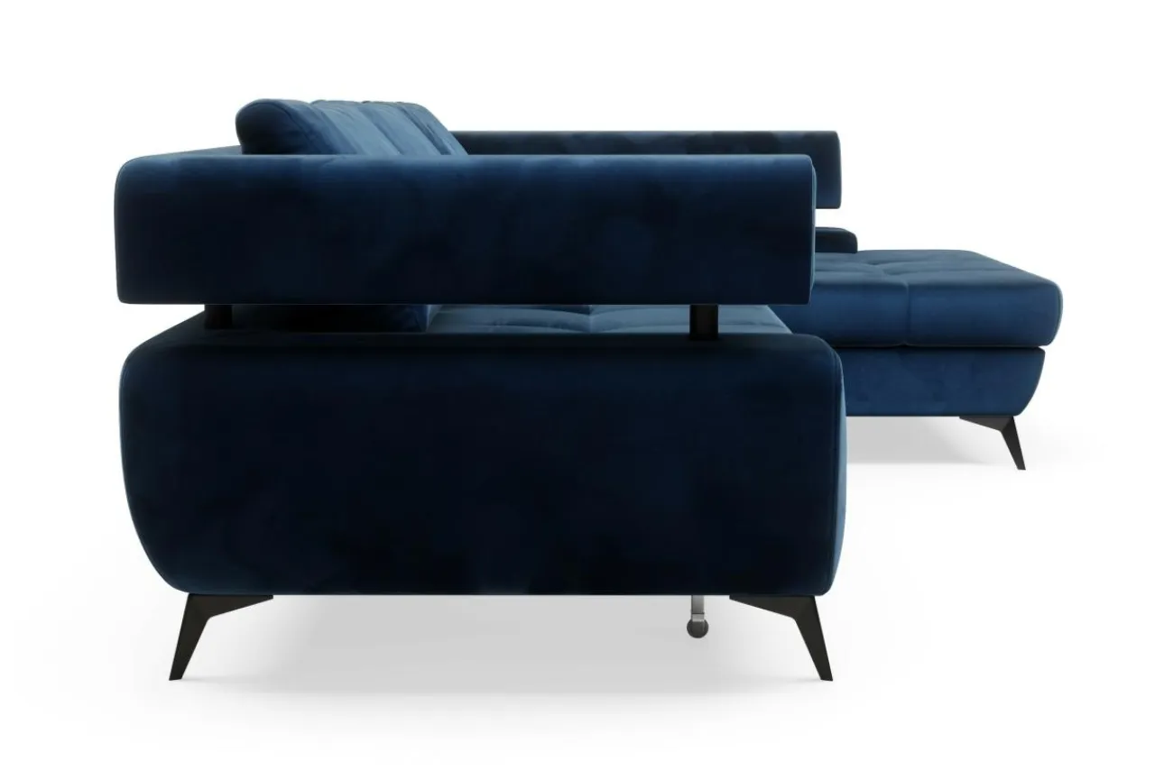 Narożnik ustawiono na metalowych, malowanych na czarno nóżkach, które wraz z granatową tkaniną tworzą interesujący kontrast.