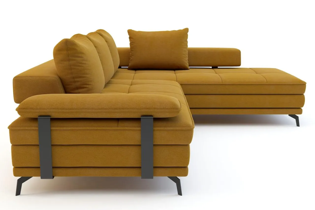 Narożnik FLORENCE w musztardowym kolorze wykończony surowymi, metalowymi obiciami przukuje Twoją uwagę.