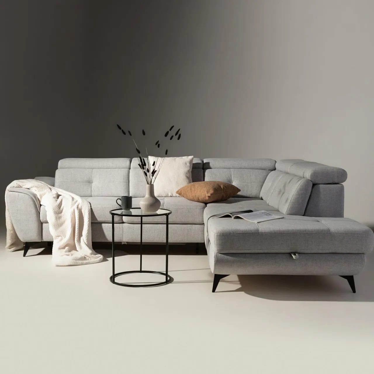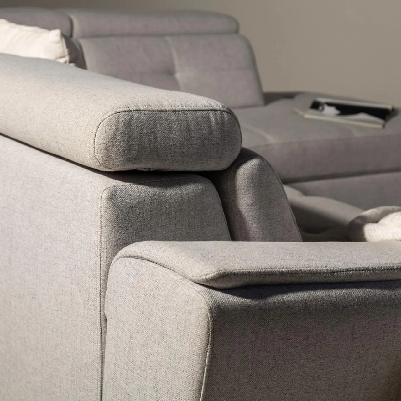 SERGIO to średniej wielkości narożnik wykończony w całości tkaniną NEVE w szarym kolorze.