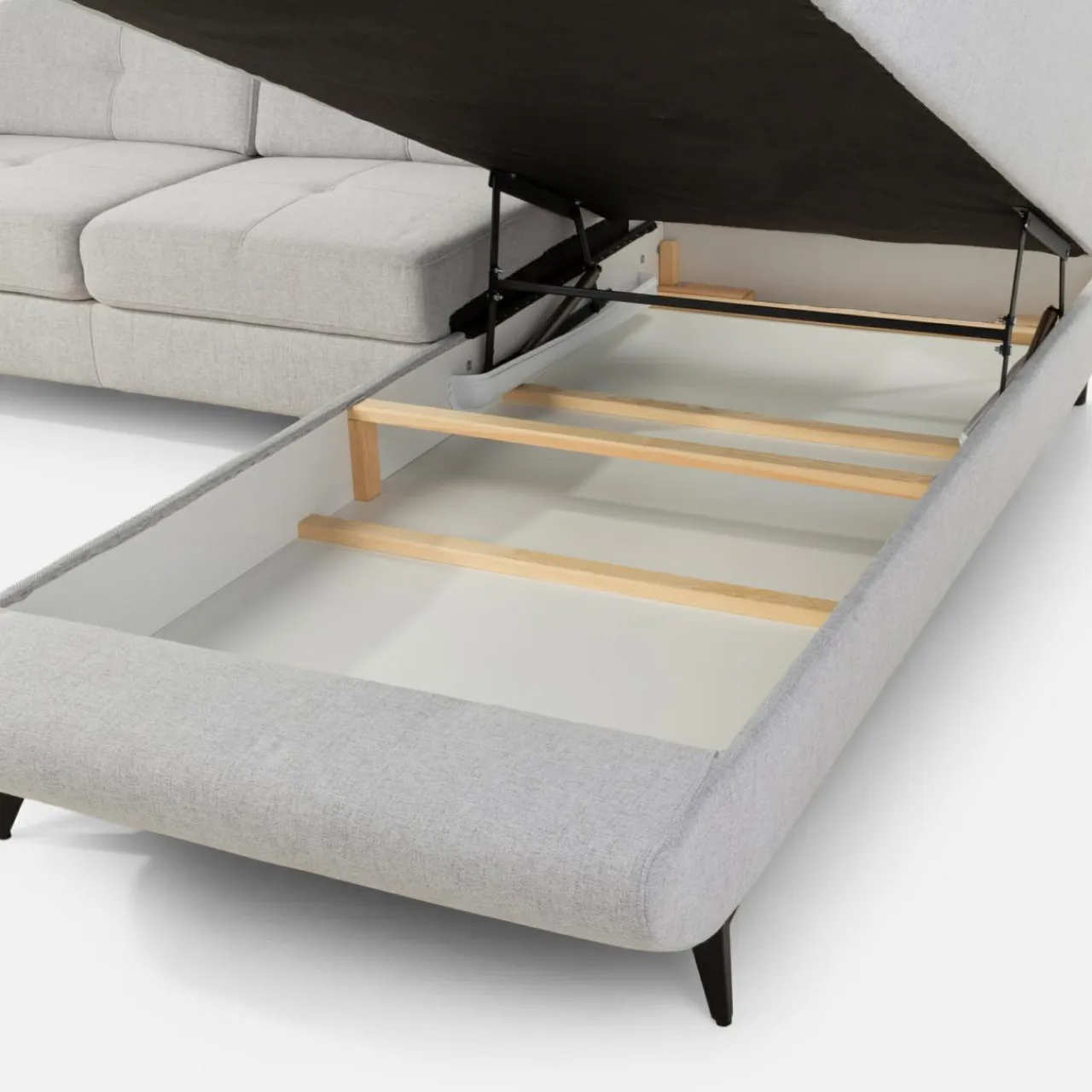 Pod leżanką znajduje się pojemnik na pościel. Podnoszenie ułatwia uchwyt i specjalny mechanizm.