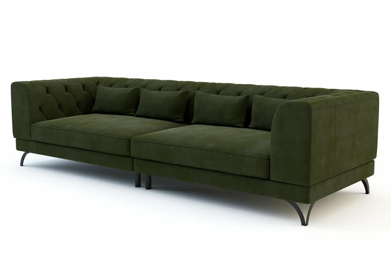 - Sofa ma pikowane oparcie, dzięki któremu przypomina sofy w typie chesterfield.