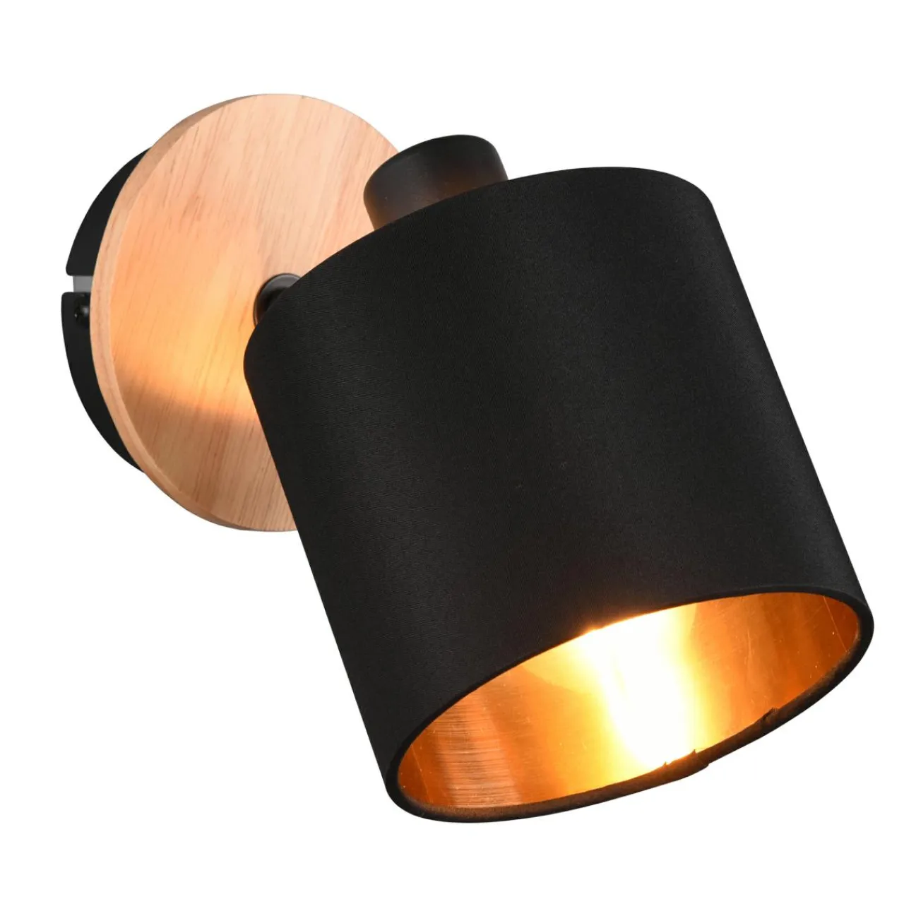 Drewniana kryza przy podstawie oraz wykończona złotym kolorem wewnętrzna część abażuru sprawia, że lampa wizualnie łączy się z wykończonymi drewnianym dekorem meblami oraz dodatkami dekoracyjnymi w ciepłej tonacji.