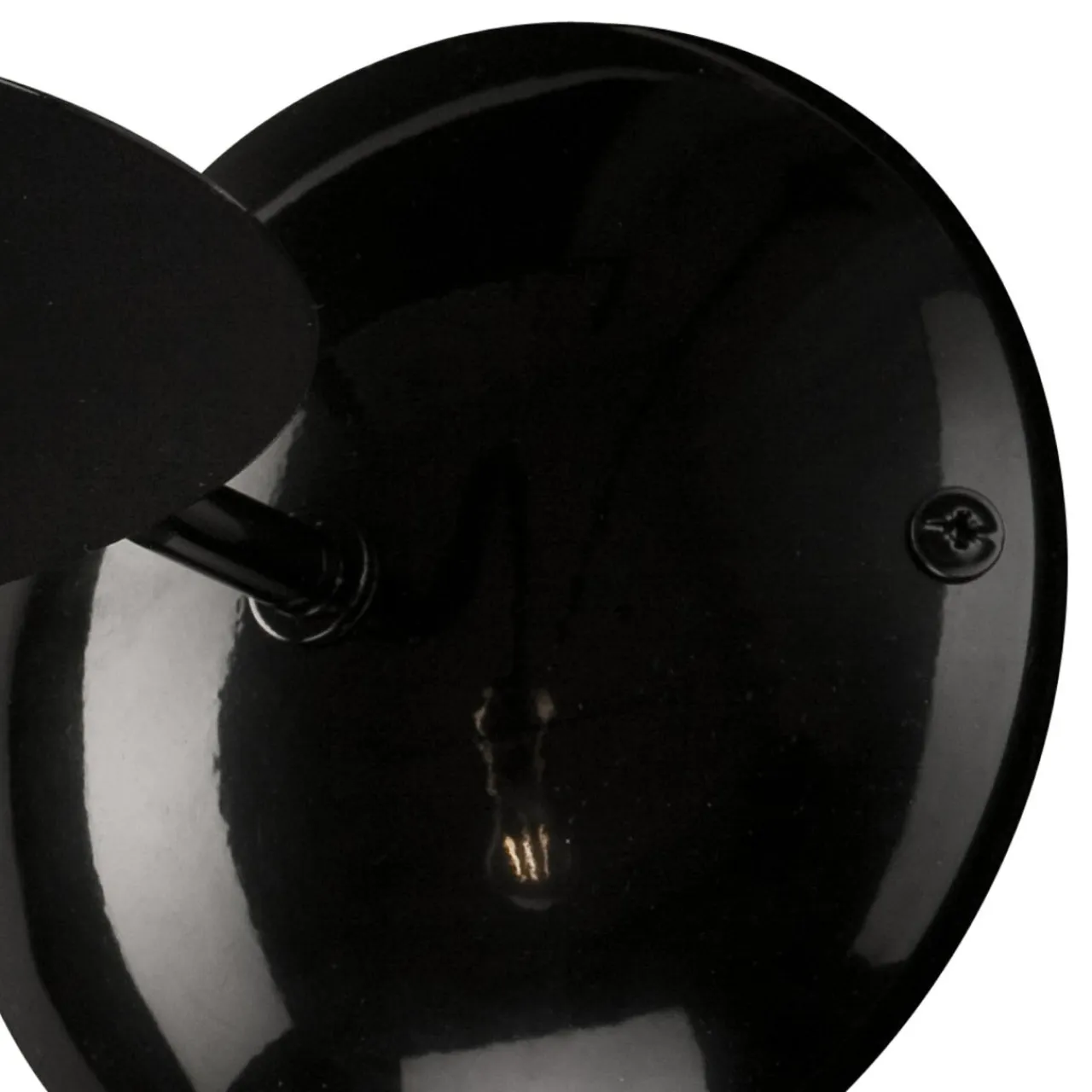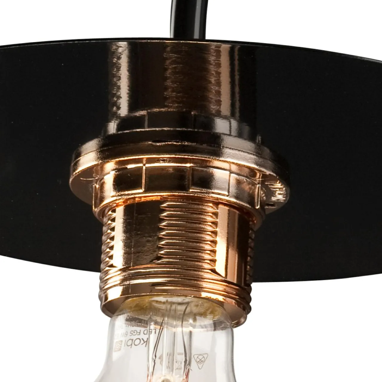 Czarne wykończenie lampy lekko błyszczy w świetle, a jednolity kolor bazy i ramienia dodatkowo podkreśla metaliczny odcień miedzi przy oprawie żarówki.