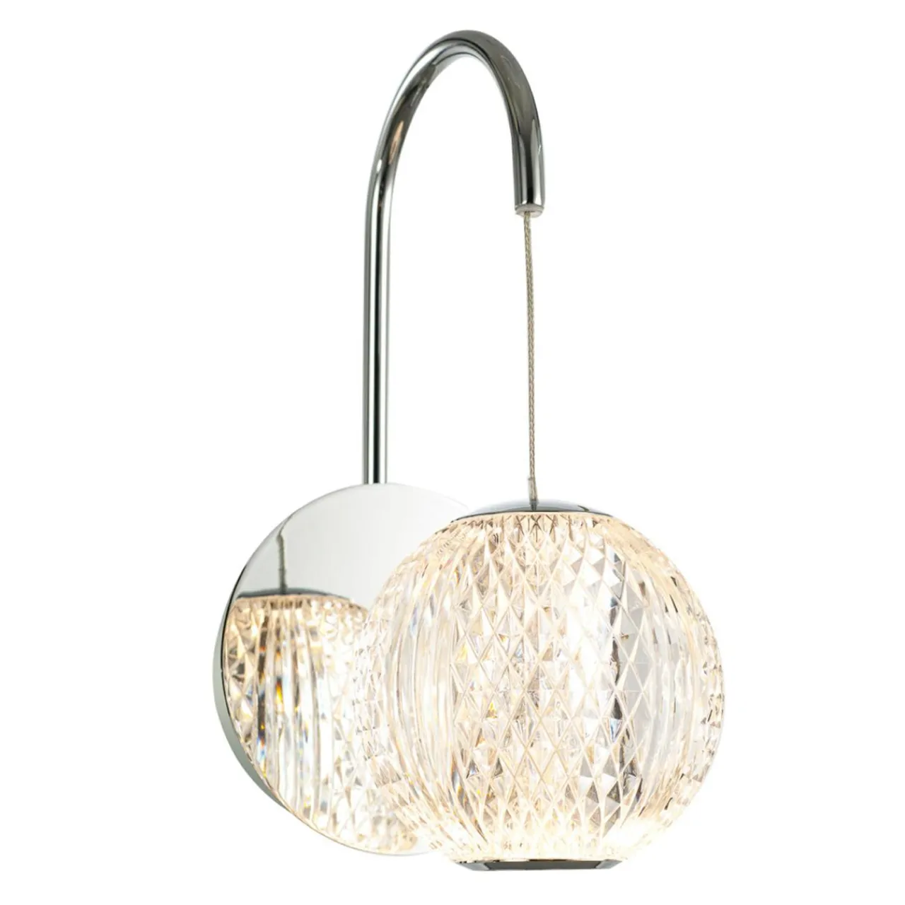 - Kinkiet posiada podstawę, od której biegnie wygięte ramię z przewodem, na którym został zawieszony kulisty klosz.