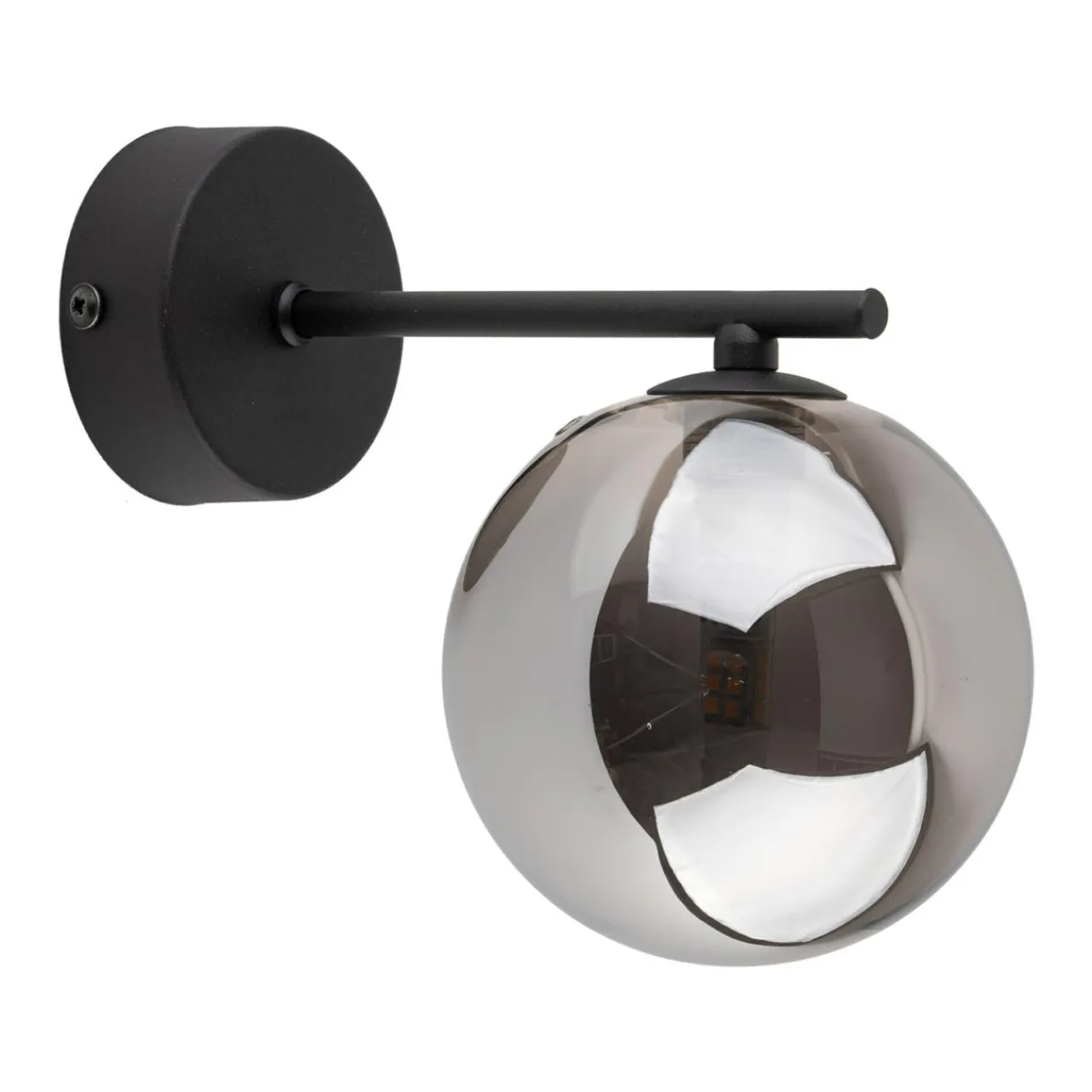 Kulisty klosz osadzony na prostym, metalowym ramieniu jest transparentny i lekko przydymiony. Wykończony czarnym kolorem jest eleganckim dopełnieniem salonu utrzymanego w nowoczesnej estetyce. Komponuje się bielą, szarością oraz szkłem i chromem.