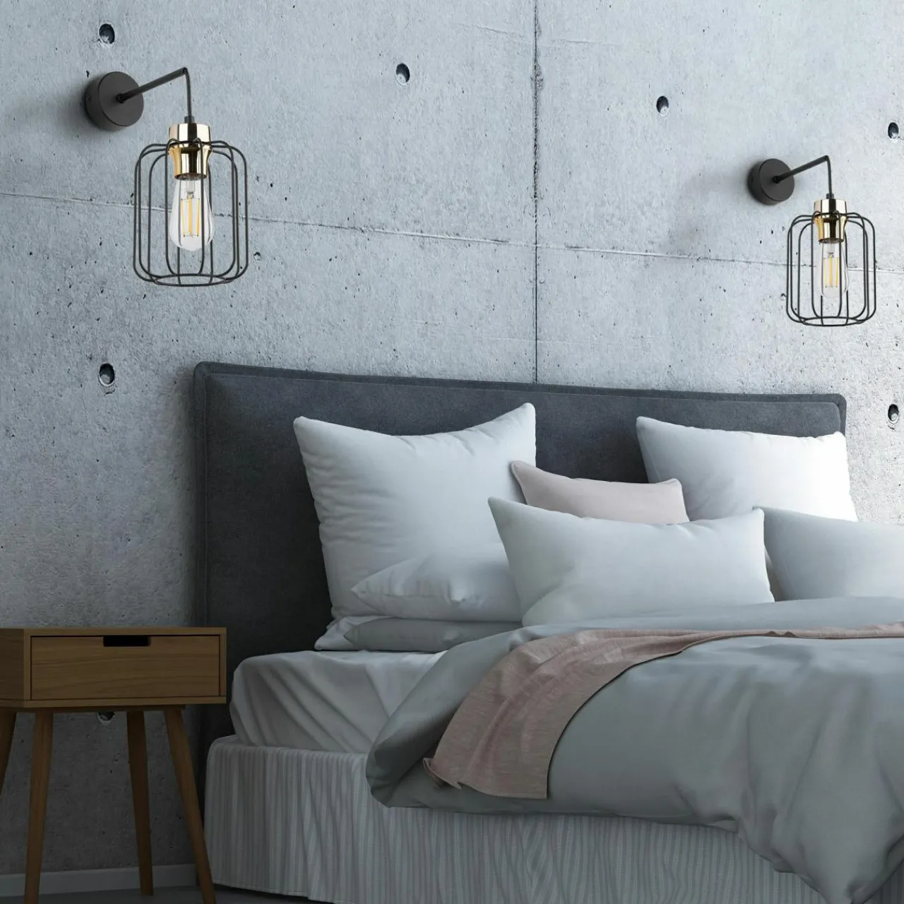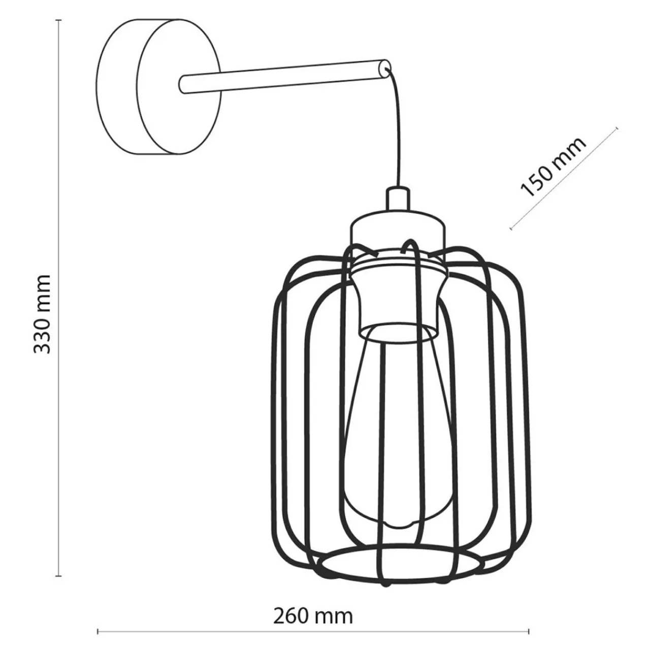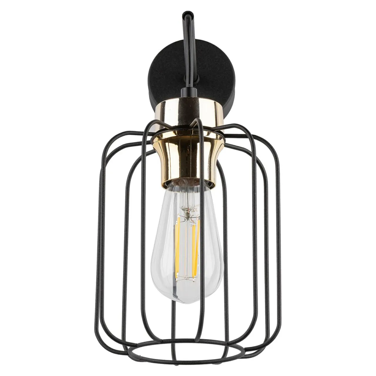Klosz kinkietu cechuje prosta, metalowa budowa o geometrycznym kształcie, która daje duże możliwości pod kątem pokazania kształtu i koloru ozdobnych żarówek.
