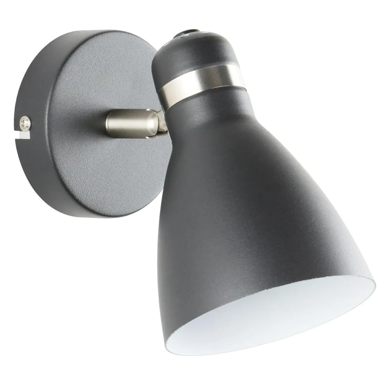 Znakiem szczególnym, podkreślającym oryginalność jest niklowana kolorystyka ramienia kinkietu i pierścień w górnej jego części. Całą resztę pokrywa matowa czerń, jedynie środek klosza jest wykończony na biało.