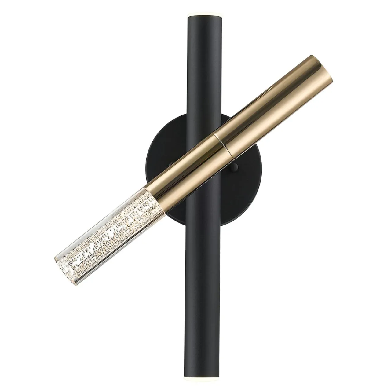 Obudowa źródła światła w kształcie tulei została wykonana z metalu i wzbogacona o akrylowe elementy. Całość wykończono w kolorze czerni i złota. Współgra ono z jasną kolorystyką ścian, mebli oraz dodatków dekoracyjnych.