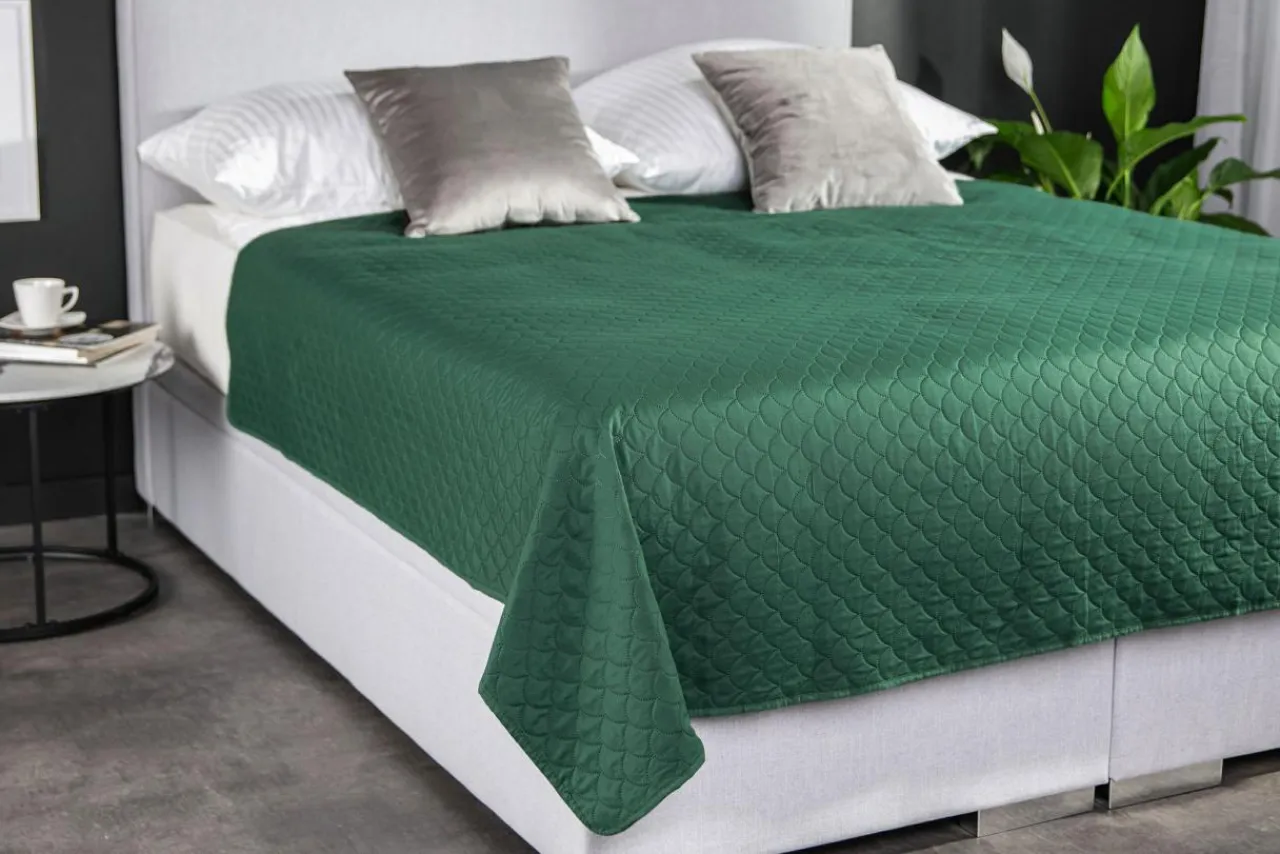 - Ciemnozielona narzuta NICEA będzie ciekawie wyglądać na tle.kremowych mebli. Przyciągnie wzrok i będzie sprzyjać wypoczynkowi.