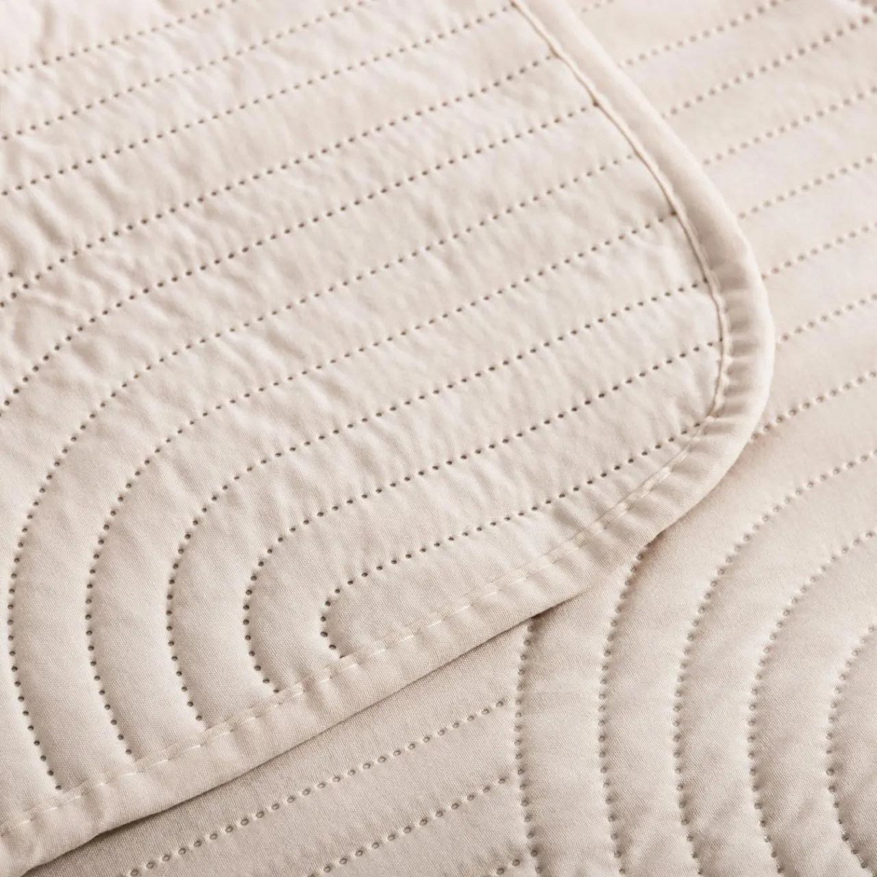 Beżowa narzuta na łóżko z kolekcji TOSCA zwraca uwagę geometrycznymi półkolistymi liniami.
