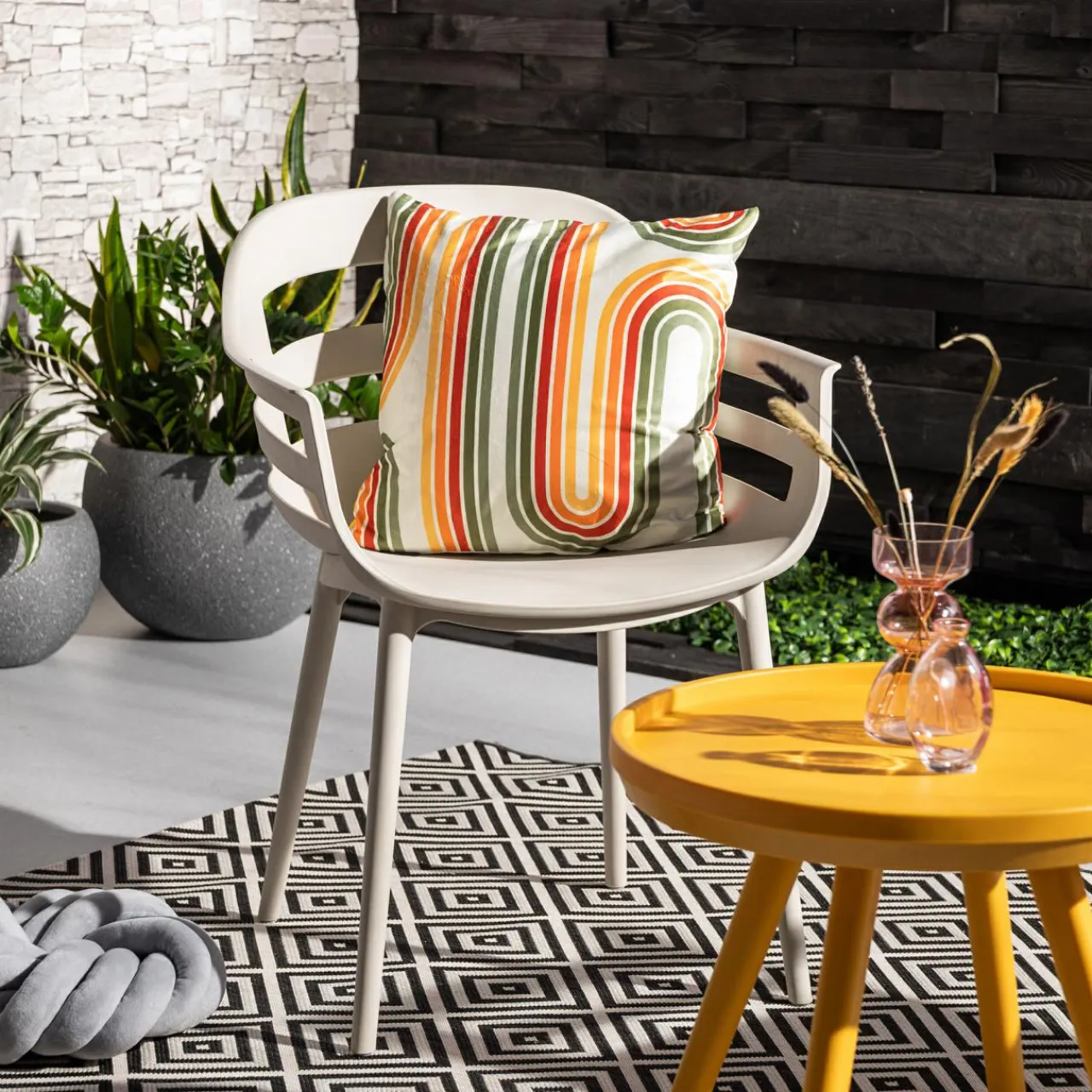 - Jasne tło rozjaśni wystrój, a kolorowy, geometryczny wzór podkreśli energetyzujące odcienie mebli i ścian.