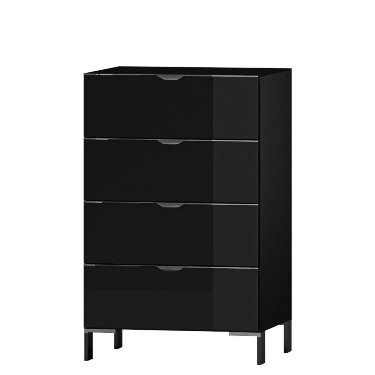 Fronty komody wykończono połyskującym lakierem, który tworzy gładką taflę i powiększa optycznie przestrzeń.