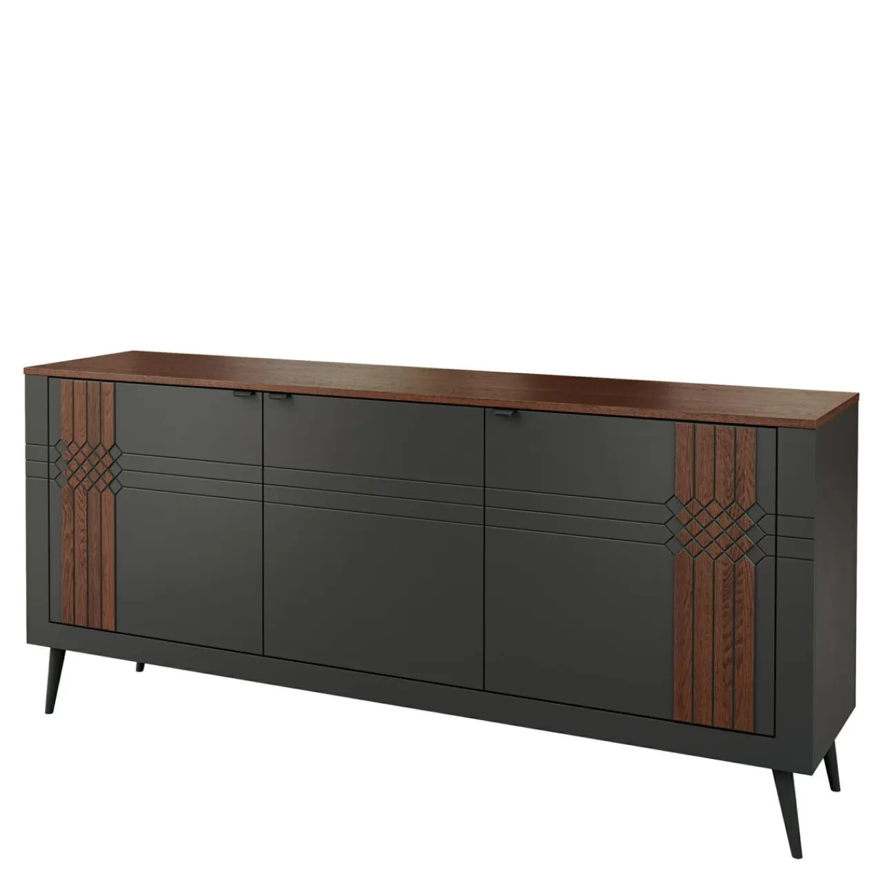 - Meble zachwycają prostą formą korpusów, geometrycznym żłobieniem oraz akcentami w kolorze ciemnego lakierowanego drewna.