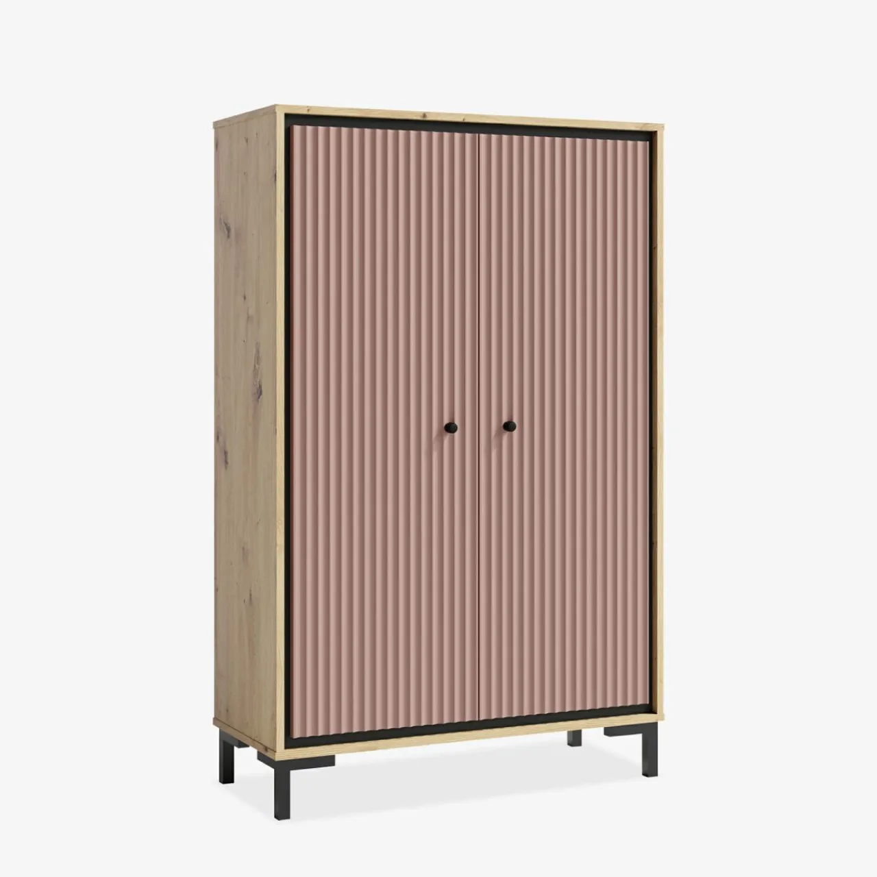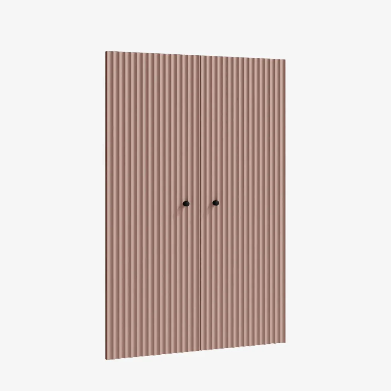 To jasnoróżowe podwójne drzwi z metalowymi uchwytami w czarnym kolorze.