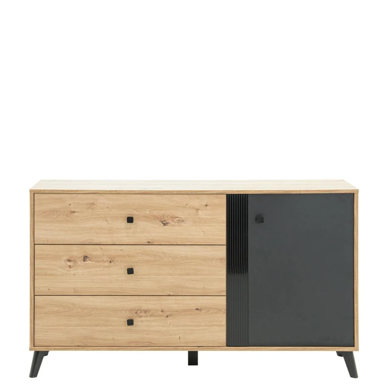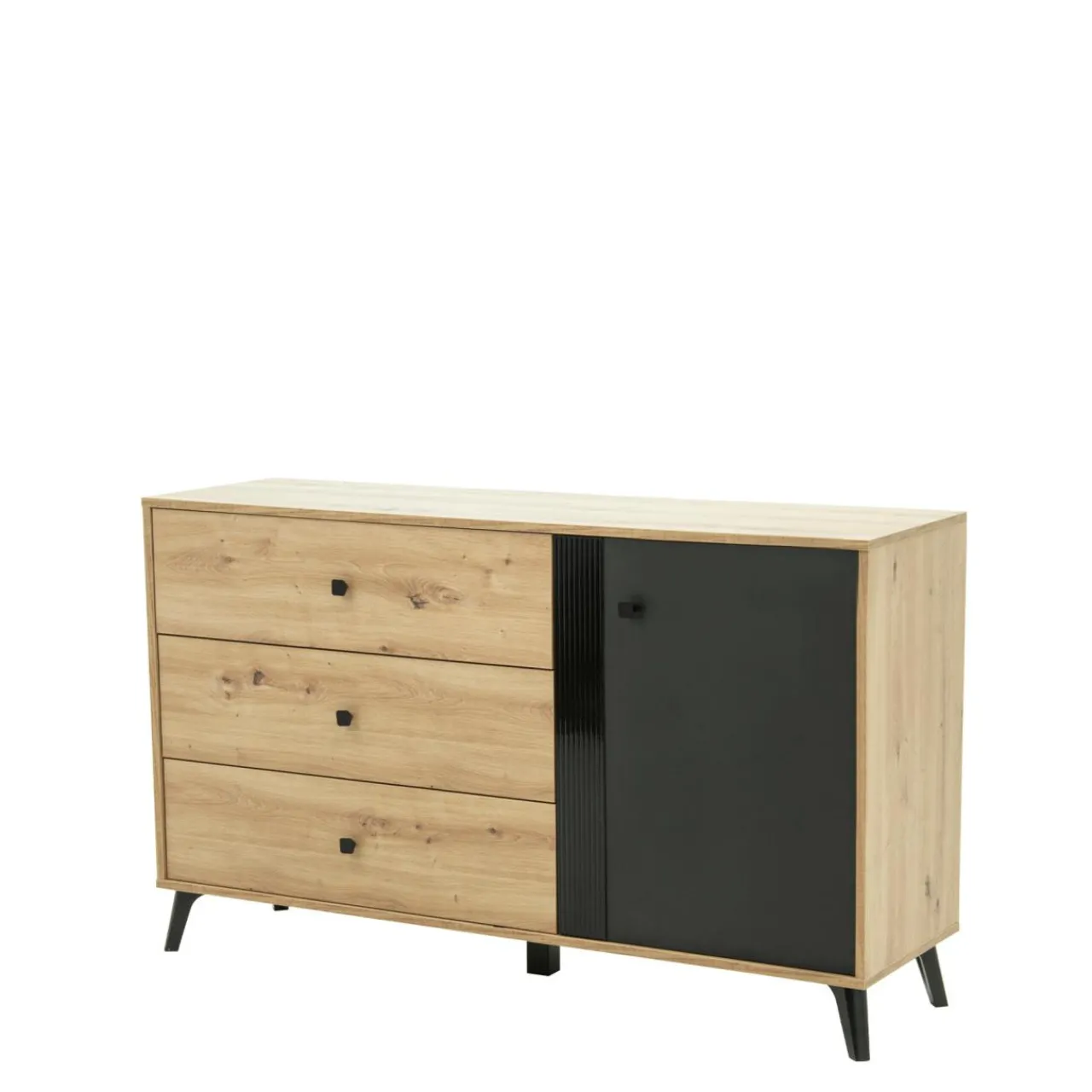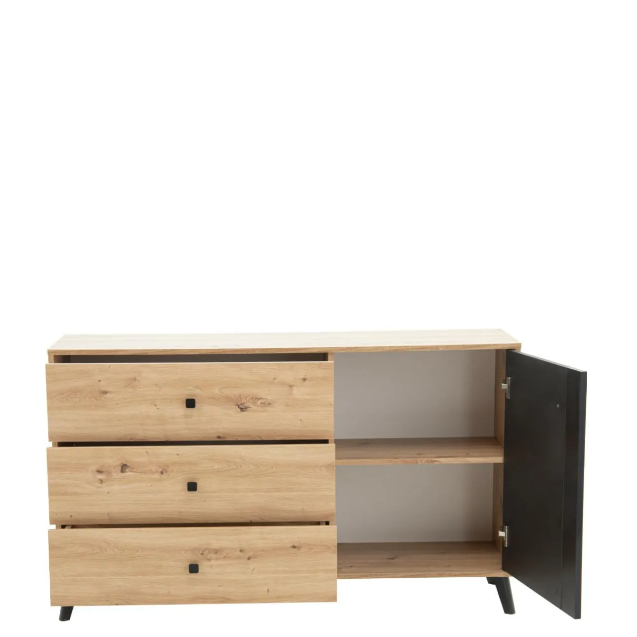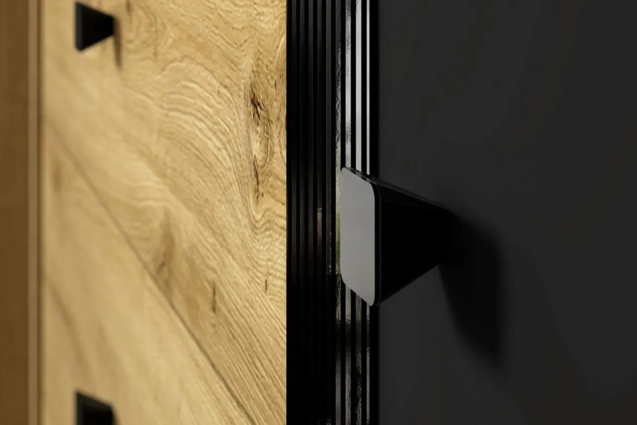 Wybarwienie w kolorze dąb artisan połączone z czarnymi elementami na froncie i ukośnymi nóżkami sprawia, że mebel odnajdzie się we wnętrzach urządzonych w stylu loftowym.