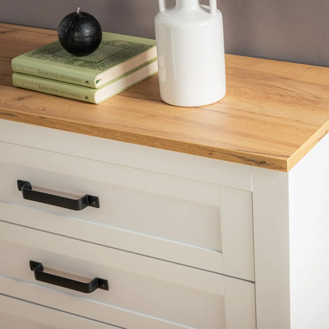 Połączenie bieli nimfea alba ze złocistym, ciepłym wybarwieniem dębu craft sprawia, że meble idealnie pasują do jasnych wnętrz wzbogaconych soczystymi barwami.
