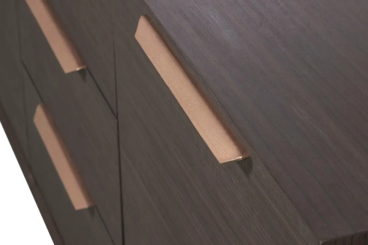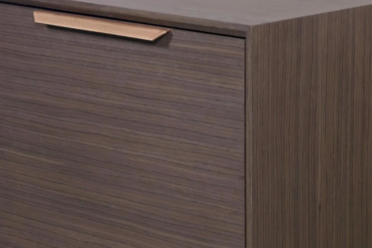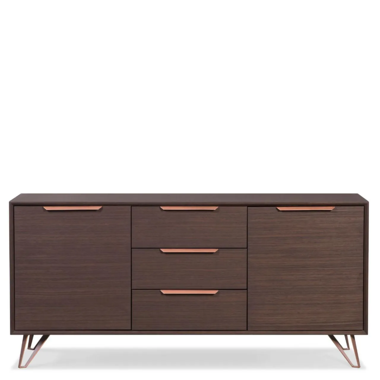 Usytuowany w jadalni, salonie lub pokoju dziennym zwraca uwagę funkcjonalnością oraz dyskretną elegancją, którą podkreślają nóżki oraz uchwyty w kolorze anodowanej miedzi.