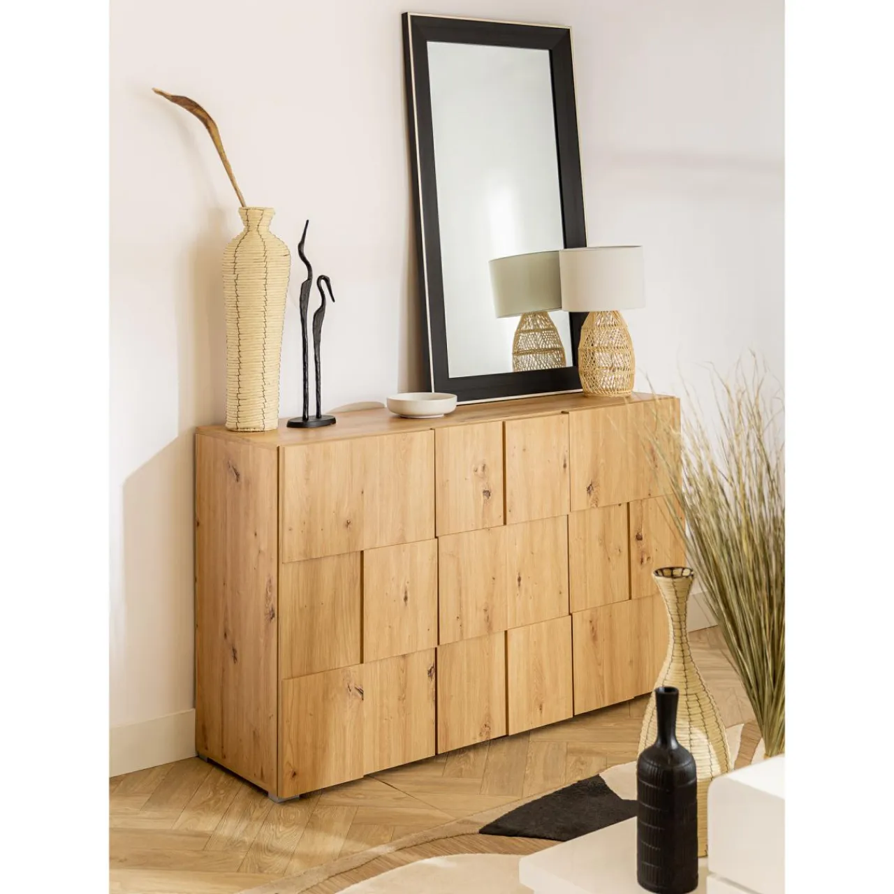 Komoda w kolorze dąb artisan nada wnętrzu przytulny charakter i nie przytłoczy go.