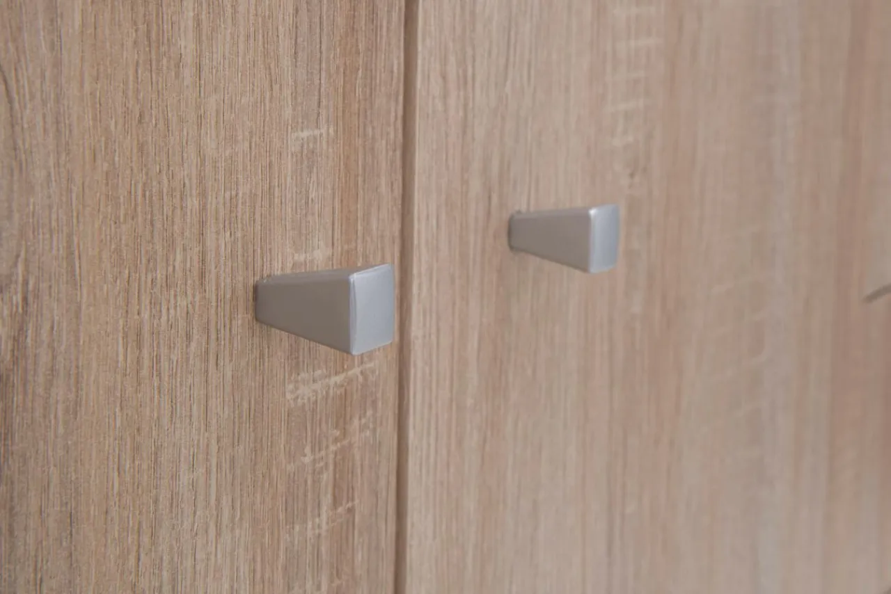 Komoda TEMPRA 2 posiada zamykane szafki z półkami oraz szuflady. Została wykonana z płyty meblowej, pokrytej folią. Całość jest utrzymana w jasnej tonacji kolorystycznej dąb sonoma.