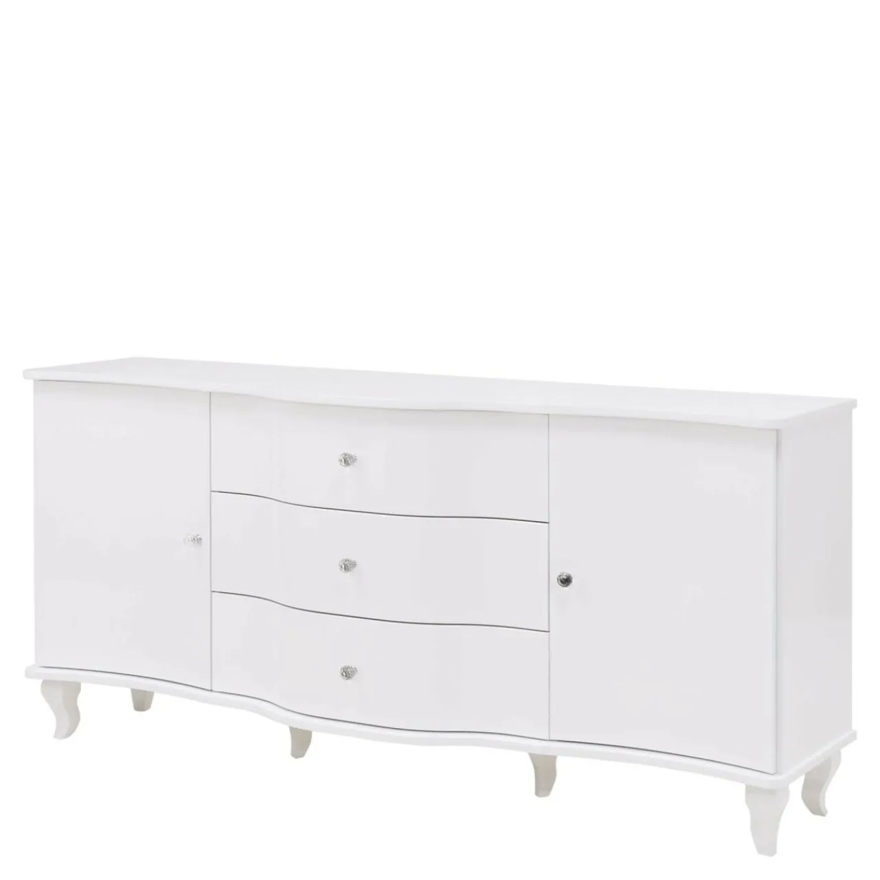 Komodę wykończono połyskującym lakierem. Dzięki temu komoda powiększa optycznie przestrzeń.
