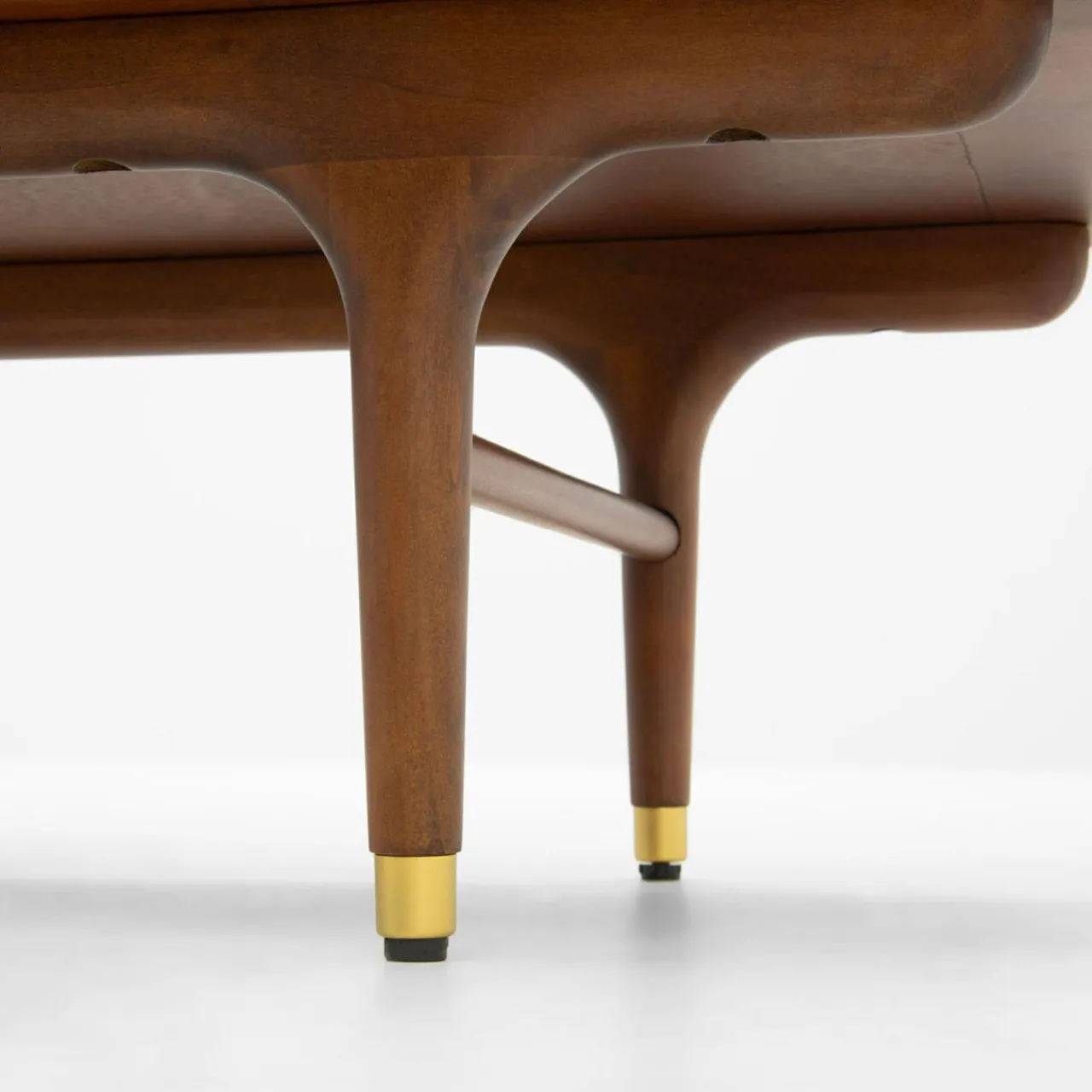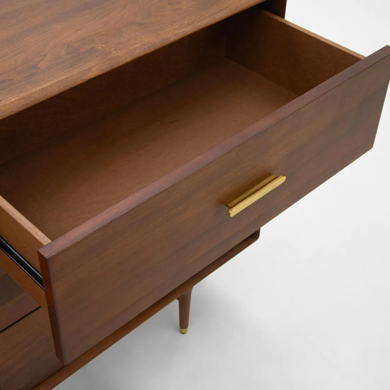 Minimalistyczne akcenty z mosiądzu w postaci uchwytów i końcówek nóżek podkreślają jakość wykonanych mebli.