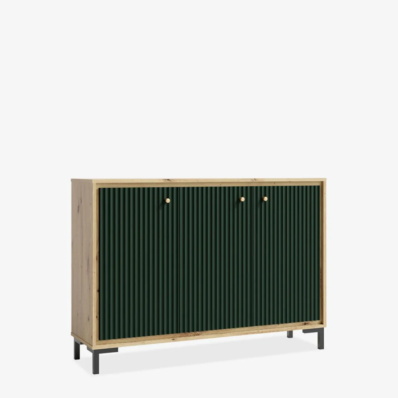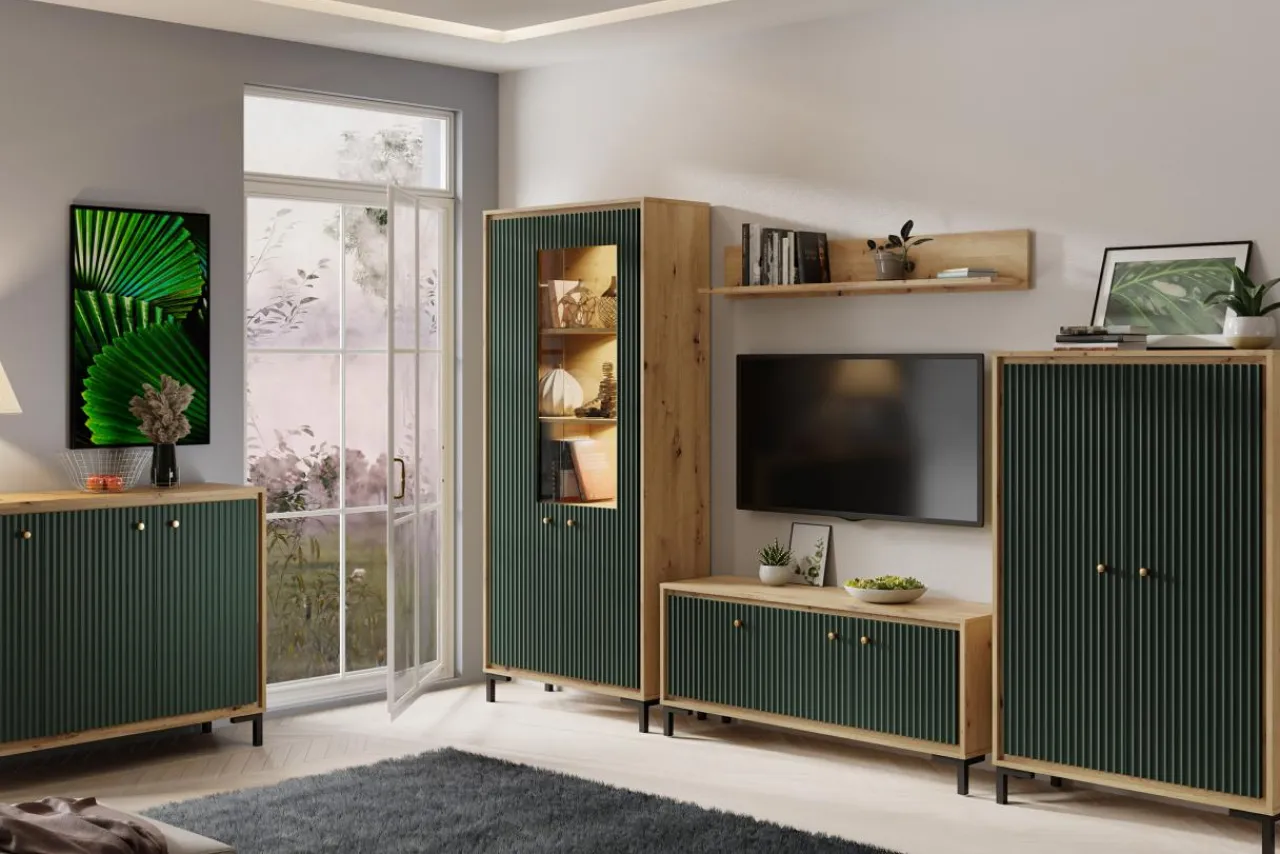Fronty z ryflowaniem oraz korpus w wybarwieniu dąb artisan sprawiają, że meble wpasowują się w nowoczesne trendy.