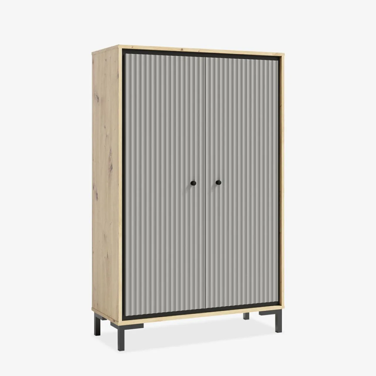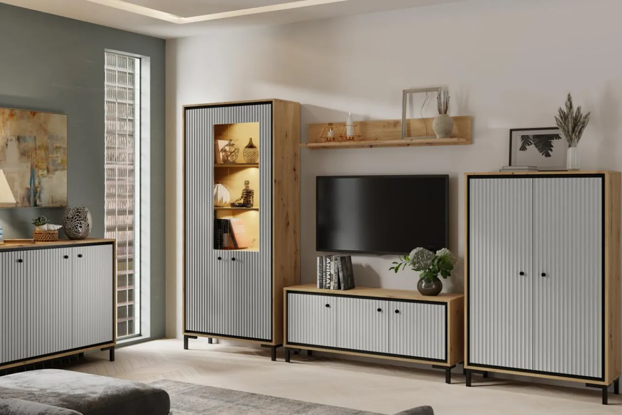 Fronty z ryflowaniem oraz korpus w wybarwieniu dąb artisan sprawiają, że meble wpasowują się w nowoczesne trendy.