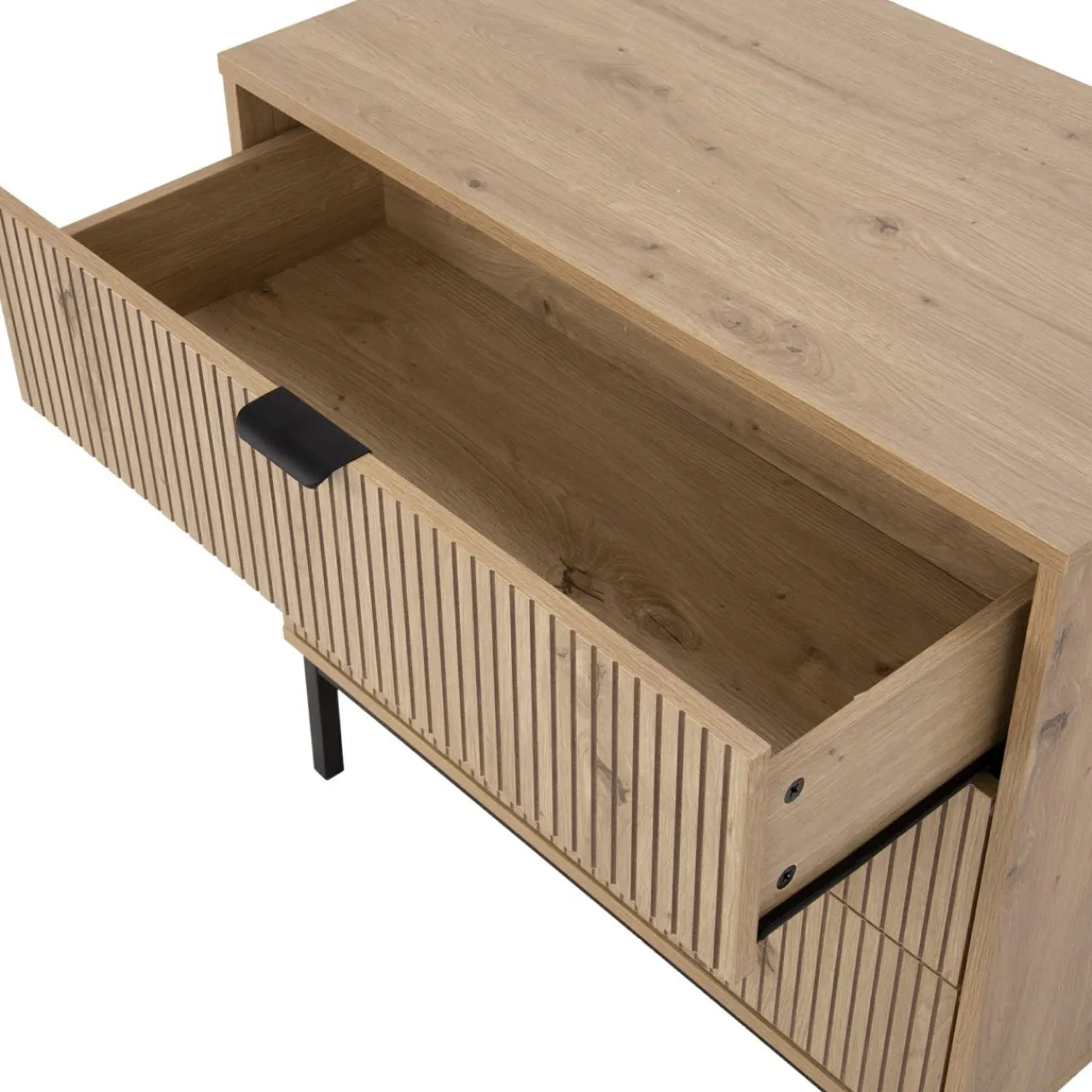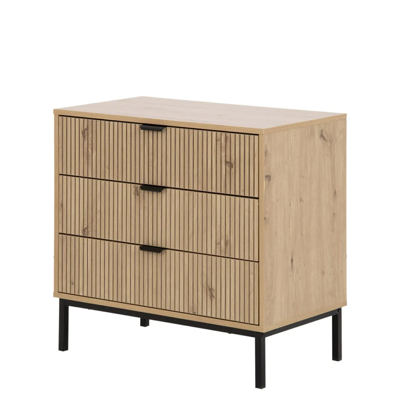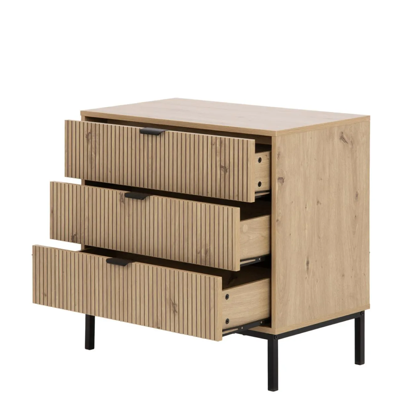 - Komoda posiada 3 szuflady, które łatwo wysuniesz dzięki kulkowym prowadnicom i czarnym metalowym uchwytom.