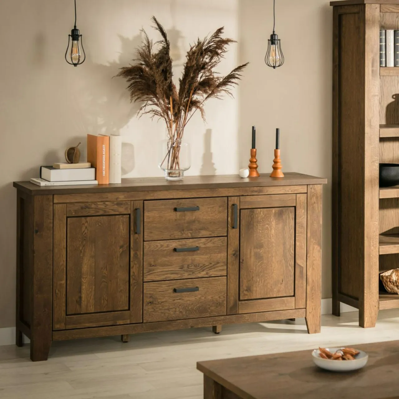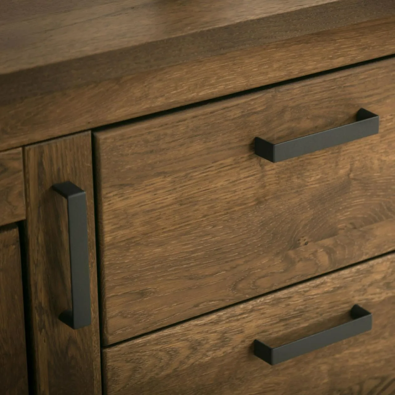 - Dąb sękaty ma charakterystyczną teksturę – naturalne pęknięcia, sęki i wgłębienia sprawiają, że mebel nabiera niepowtarzalnego wyglądu.