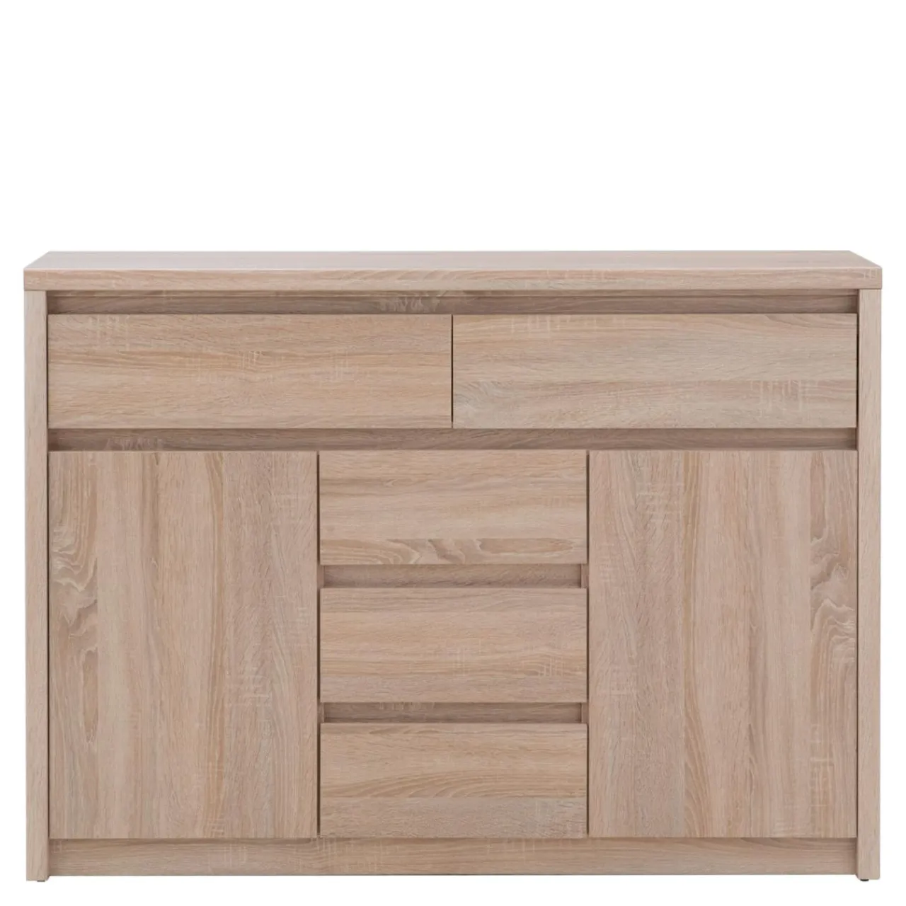Komoda NORTON charakteryzuje się prostą minimalistyczną formą, która sprawia, że mebel pasuje do nowoczesnych wnętrz. Laminat w jasnym kolorze dębu sonoma, dekorem przypominający drewno, wprowadzi do pomieszczenia przytulny klimat. Brak tradycyjnych uchwytów sprawia, że mebel łatwiej wkomponować w dowolną aranżację.