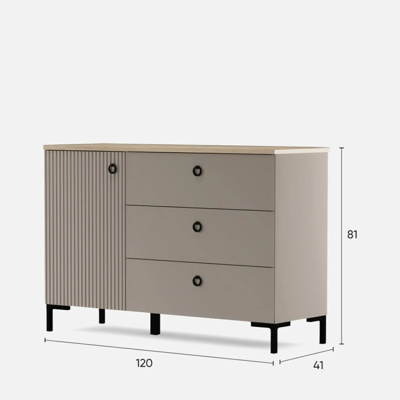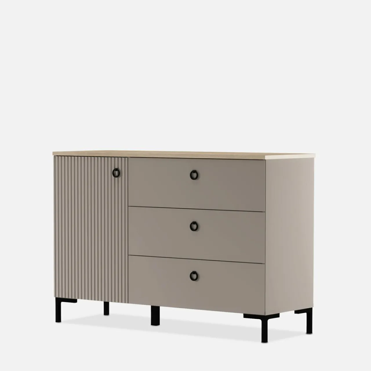 - Ryflowane fronty w kolorze taupe idealnie zgrywają się z korpusami. Wykończone są laminatem i folią.