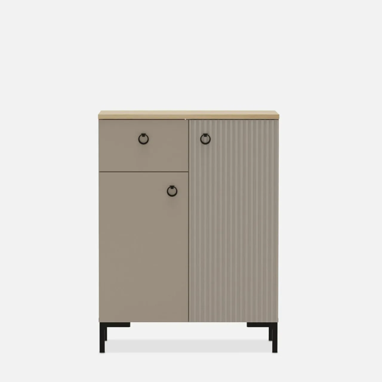 - Ryflowane fronty w kolorze taupe idealnie zgrywają się z korpusami. Wykończone są laminatem i folią.