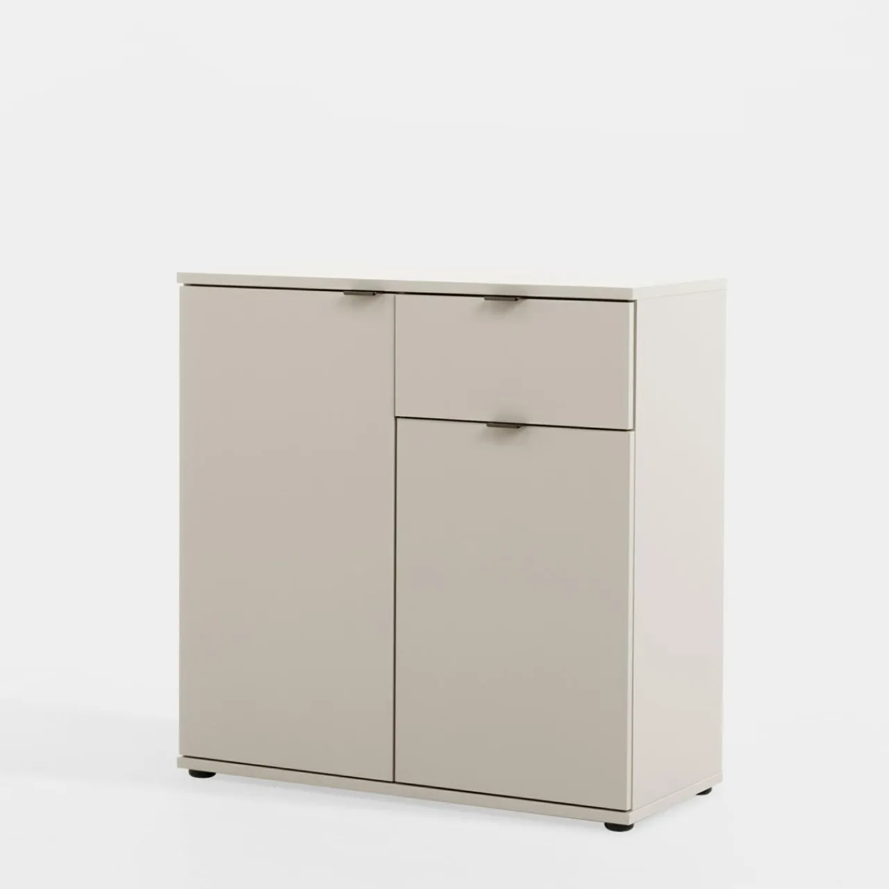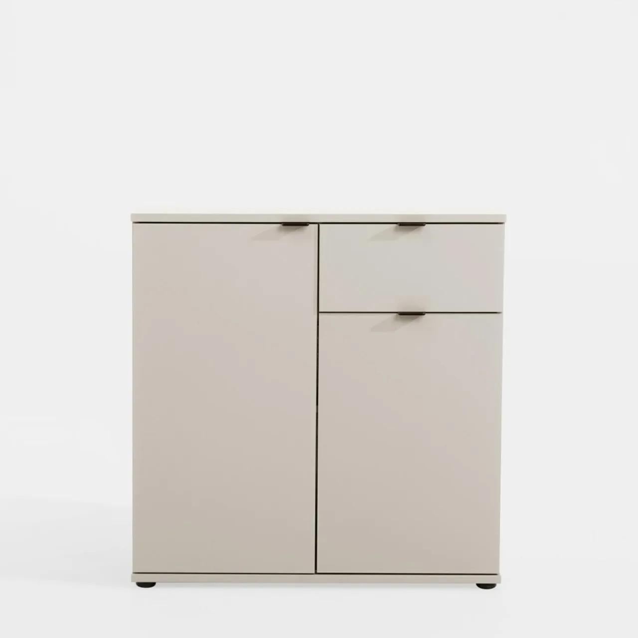 Prosta komoda GANYMEDE w odcieniu jasnego beżu to rozwiązanie do wnętrz w naturalnych tonacjach. Zamykana szafka z półką i praktyczna szuflada zapewniają wygodne przechowywanie.