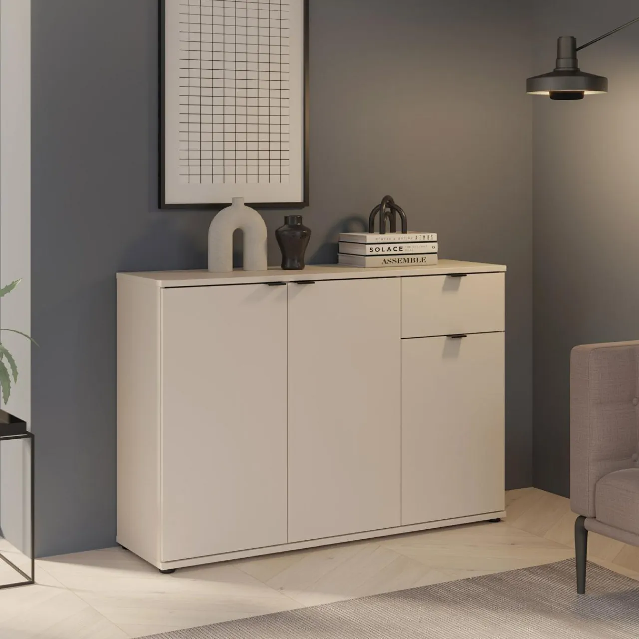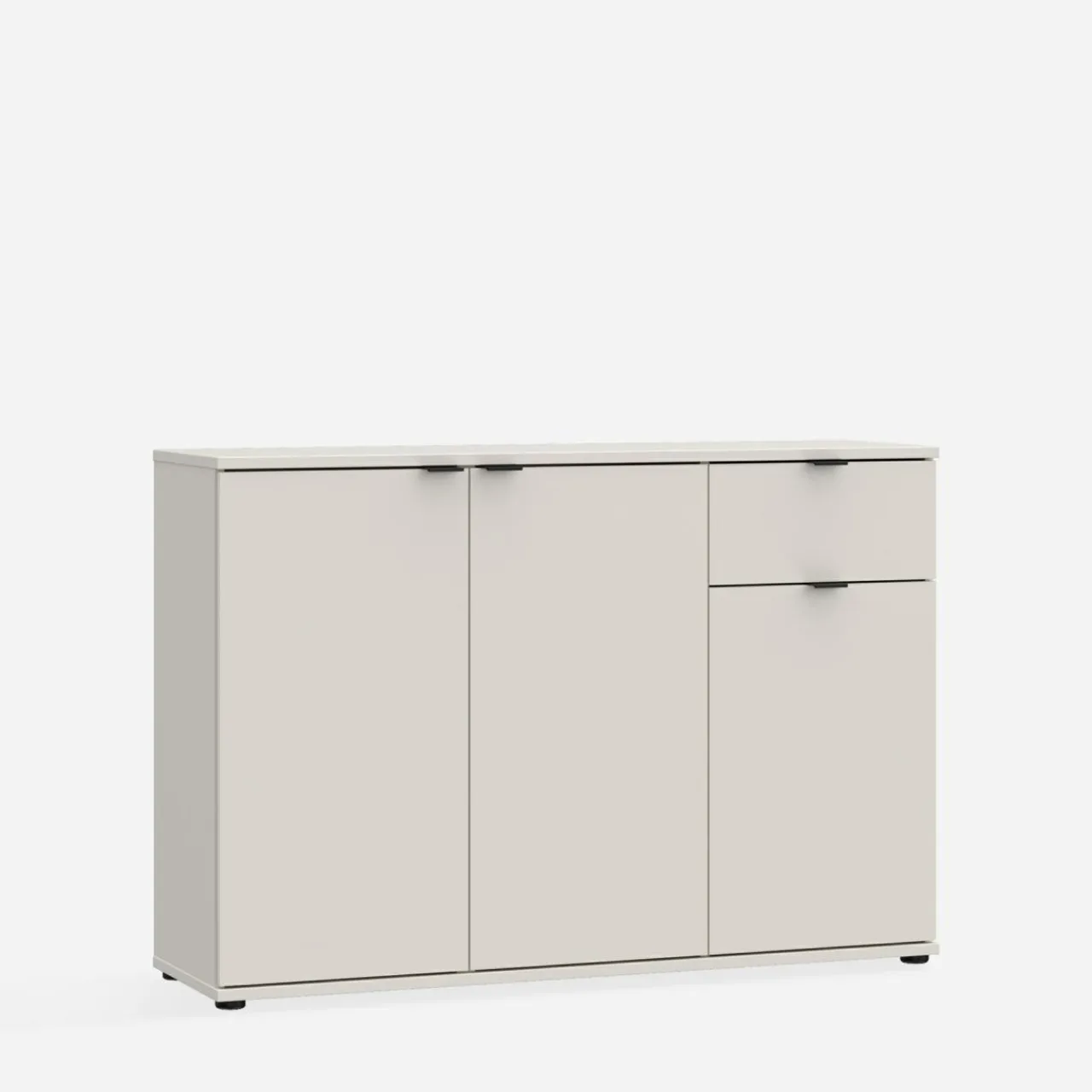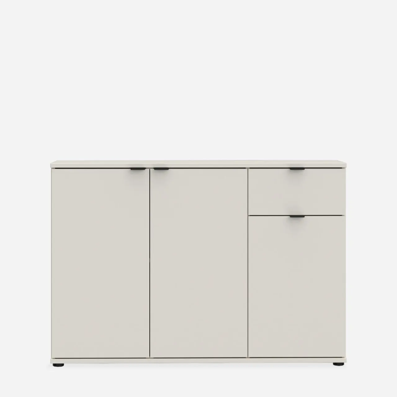Komoda 3-drzwiowa z szufladą GANYMEDE w odcieniu jasnego beżu to mebel o przemyślanej konstrukcji. Połączenie szafek i szuflady zapewnia wygodne przechowywanie, a jasna kolorystyka optycznie powiększa przestrzeń.