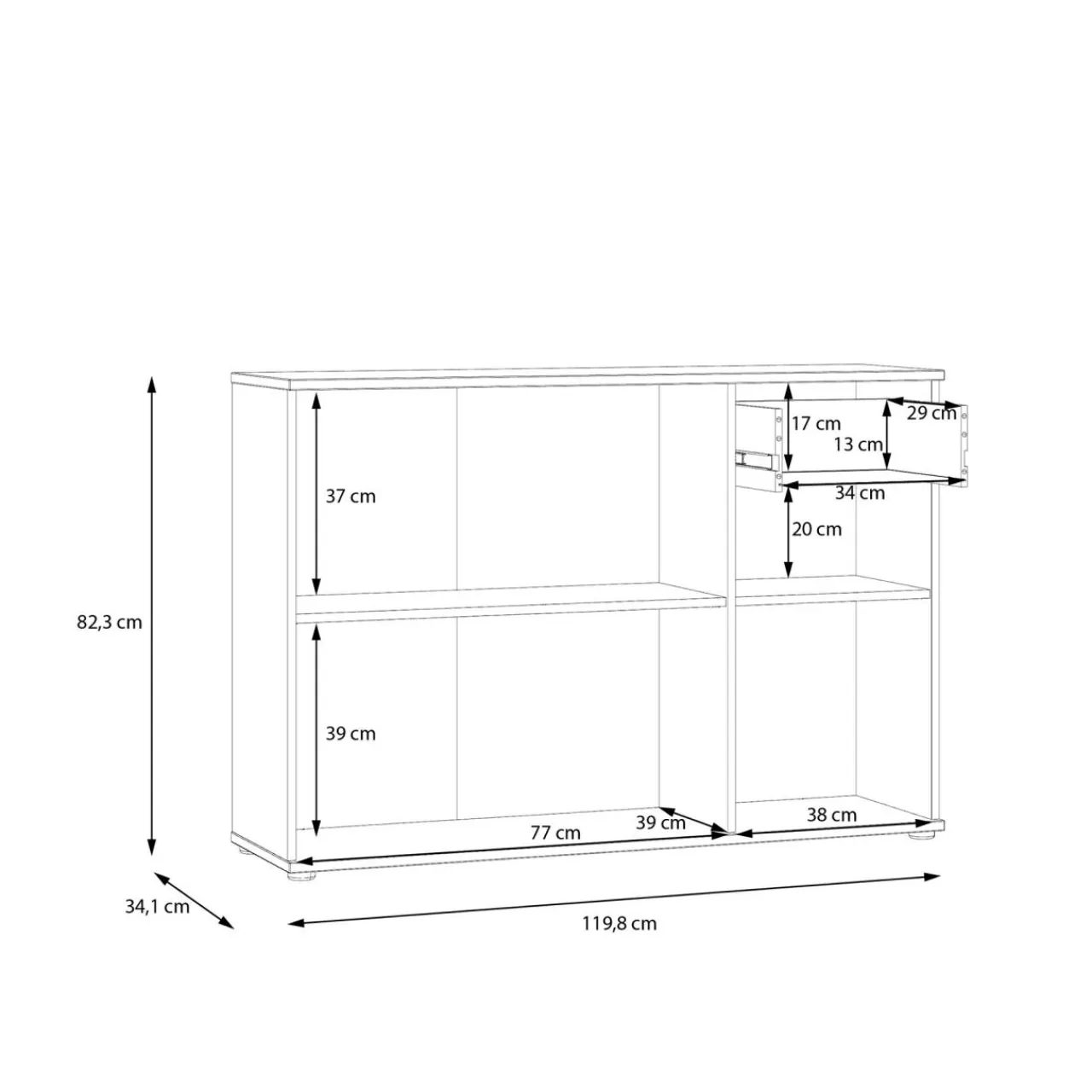 Trzydrzwiowa szafka z półkami, praktyczna szuflada.