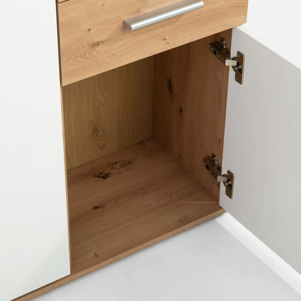 Komody IKOLI łączą nowoczesny design z praktycznym przechowywaniem. Jasne fronty i korpus w odcieniu dębu artisan dodają wnętrzu lekkości. Różne układy – od prostych dwudrzwiowych modeli po warianty z szufladami – sprawdzą się w salonie, sypialni czy biurze.