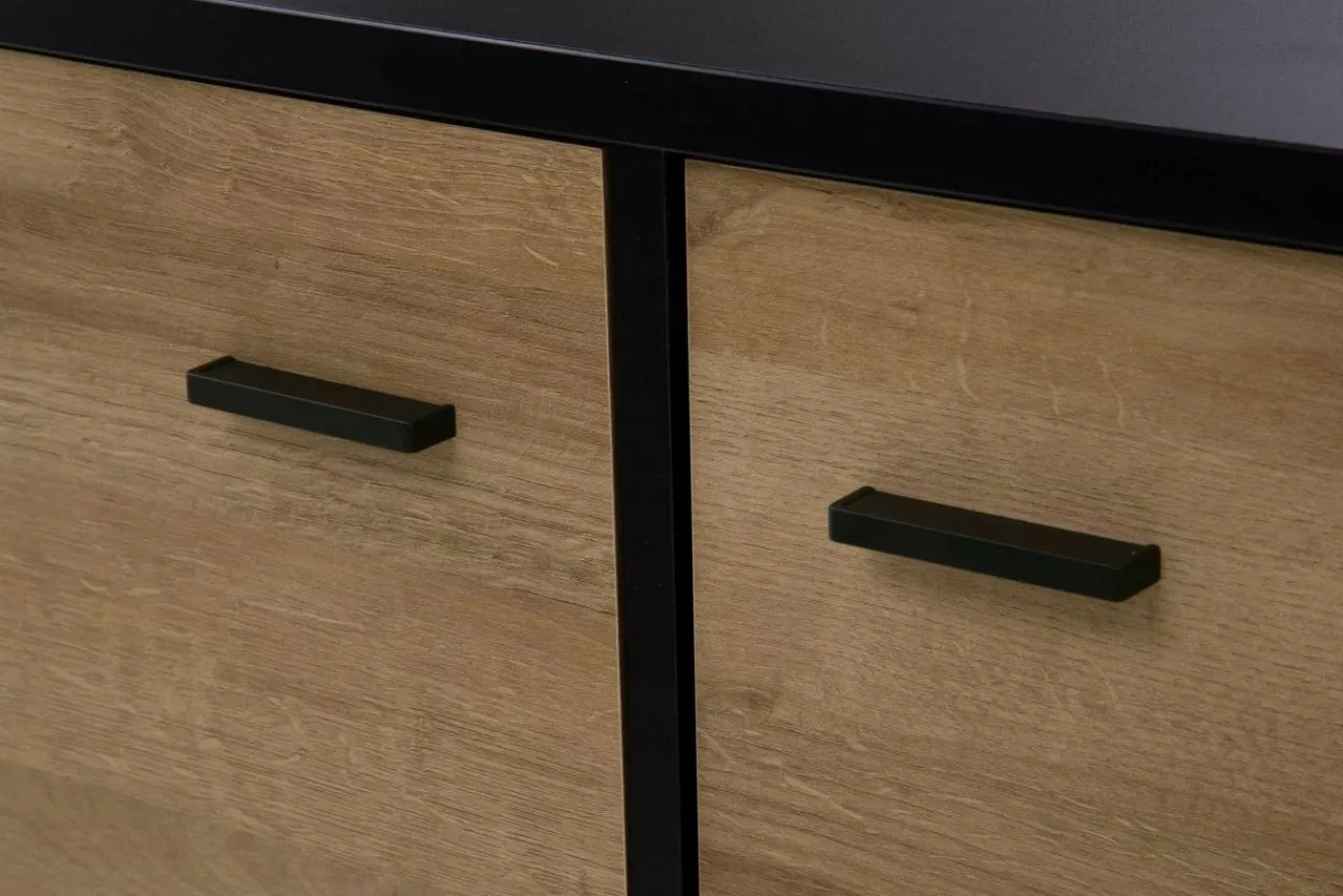 - Komoda została wyposażona w czarne, metalowe uchwyty oraz ramy z płyty MDF przechodzące w nogi, co dodatkowo podkreśla industrialny charakter wnętrza.