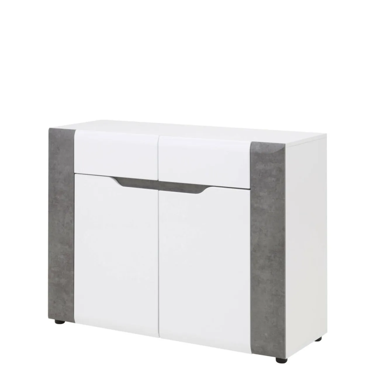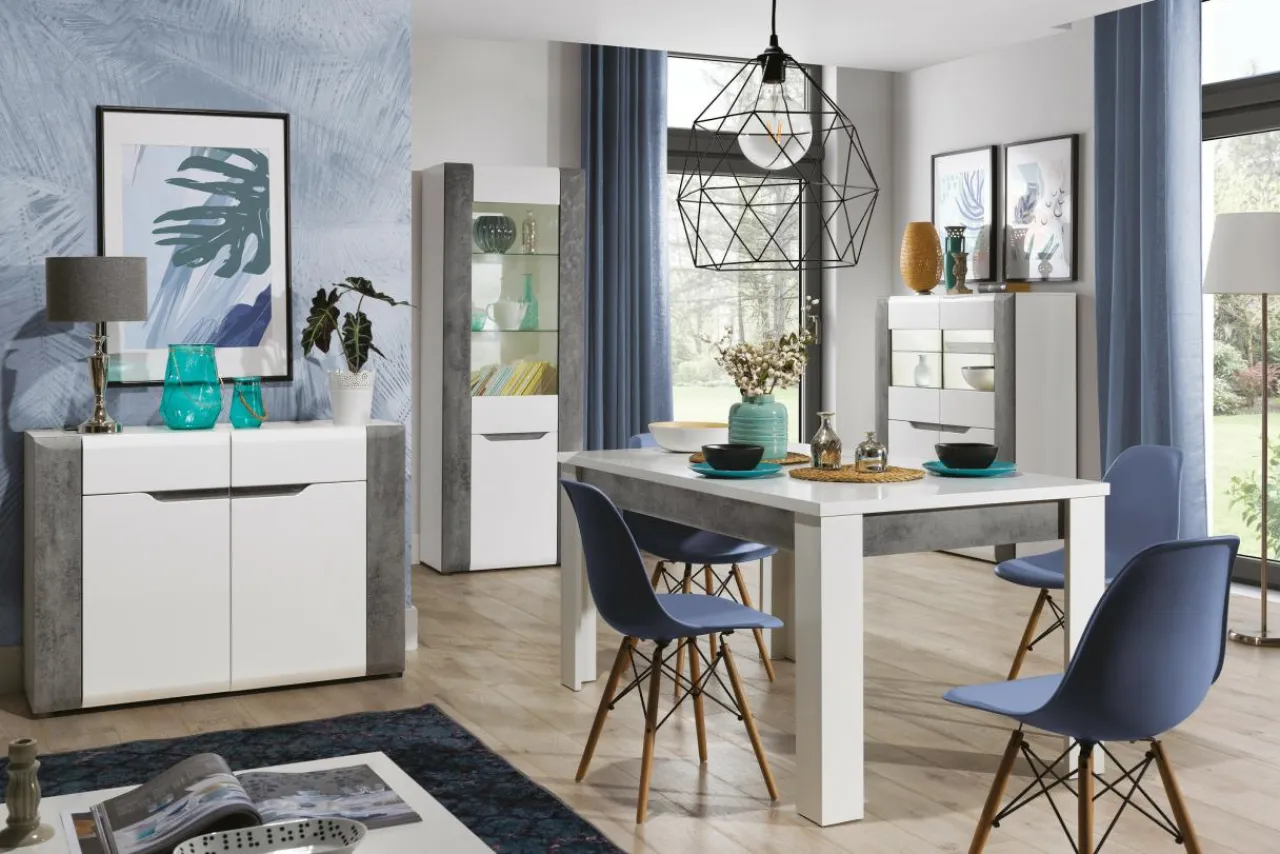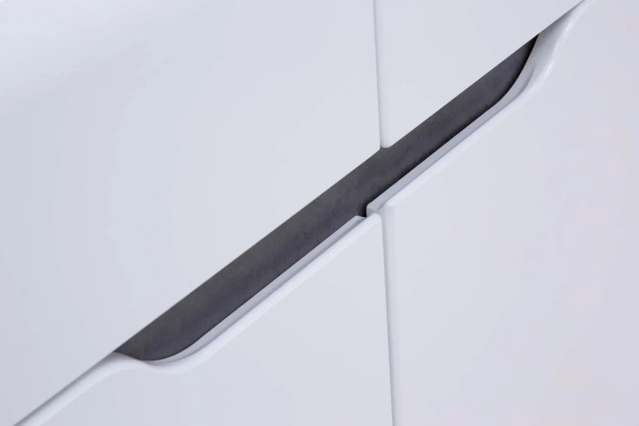 Korpus oraz blaty mebla zostały wykonane z laminowanej płyty meblowej, natomiast fronty to MDF z wykończeniem w białym połysku. Modne zestawienie bieli oraz szarości betonu dodaje komodzie BRANDO nieco surowości złagodzonej poprzez linię podchwytów we frontowej części mebla.