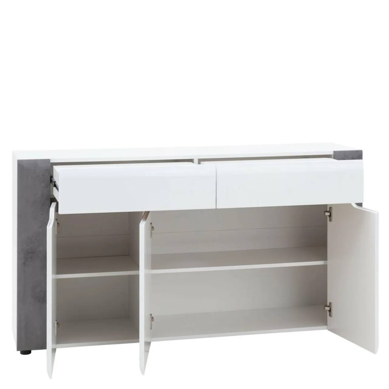 Korpus oraz blaty mebla zostały wykonane z laminowanej płyty meblowej, natomiast fronty to MDF z wykończeniem w białym połysku. Modne zestawienie bieli oraz szarości betonu dodaje komodzie BRANDO nieco surowości złagodzonej poprzez linię podchwytów we frontowej części mebla.