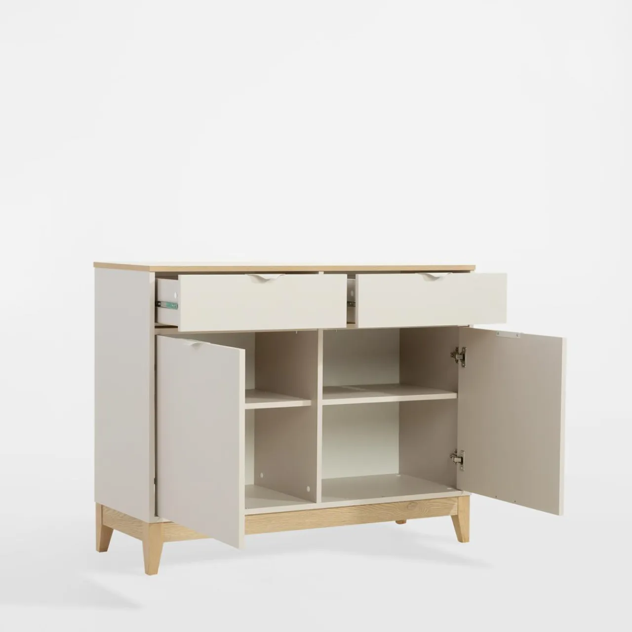- Smukłe nóżki – nie tylko ułatwiają sprzątanie pod meblem, ale również dodają lekkości całej konstrukcji, dzięki czemu komoda nie przytłacza.