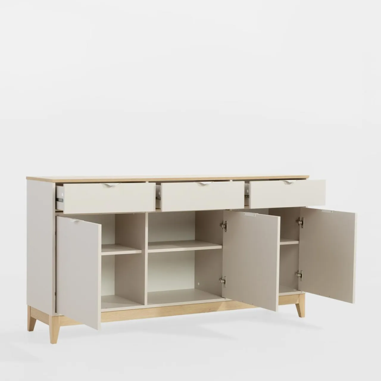 - Nóżki drewniane – sprawia, że komoda zyskuje wizualną lekkość i stabilność, a także ułatwia sprzątanie pod meblem.