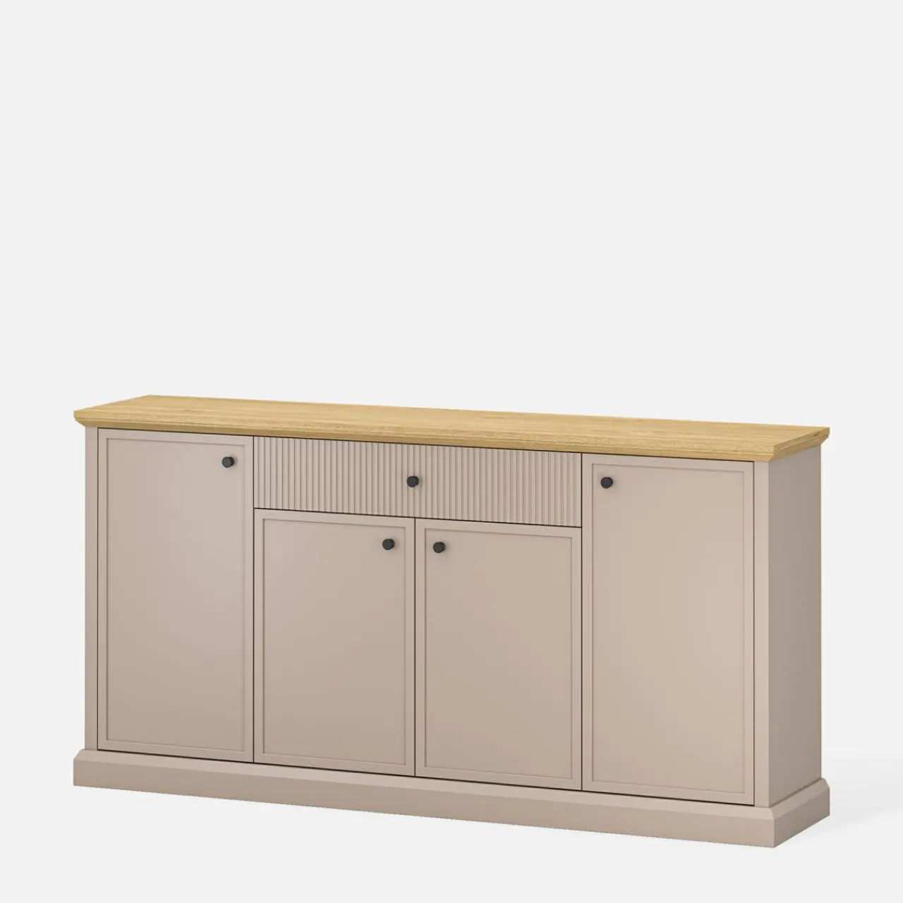 - Wyrazisty design – Połączenie taupe i dębu kamiennego nadaje komodzie elegancki wygląd, a delikatne ryflowanie na drzwiach podkreśla jej wyjątkowy styl.