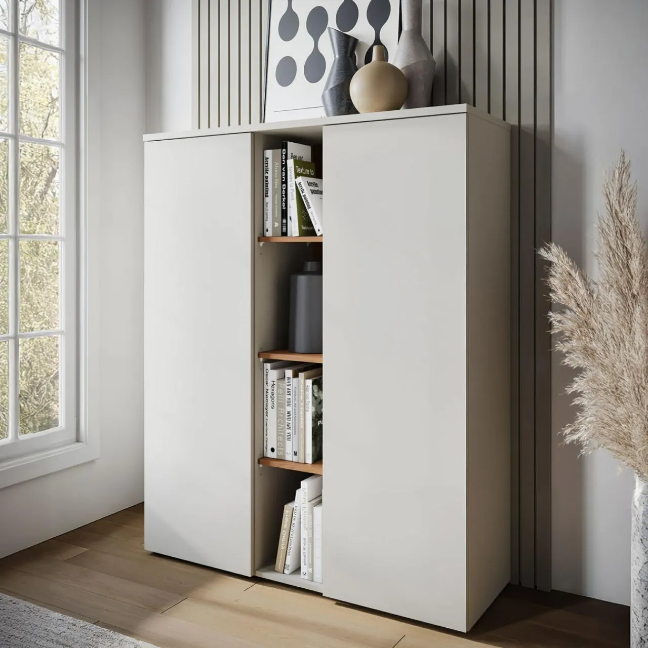 W komodzie HAMM każdy przedmiot znajdzie swoje miejsce. W zamkniętych szafkach poukładasz dekoracje, tekstylia i inne, ważne rzeczy w 8 wnękach, a pozostałe ułożysz na blacie i widocznych półkach.