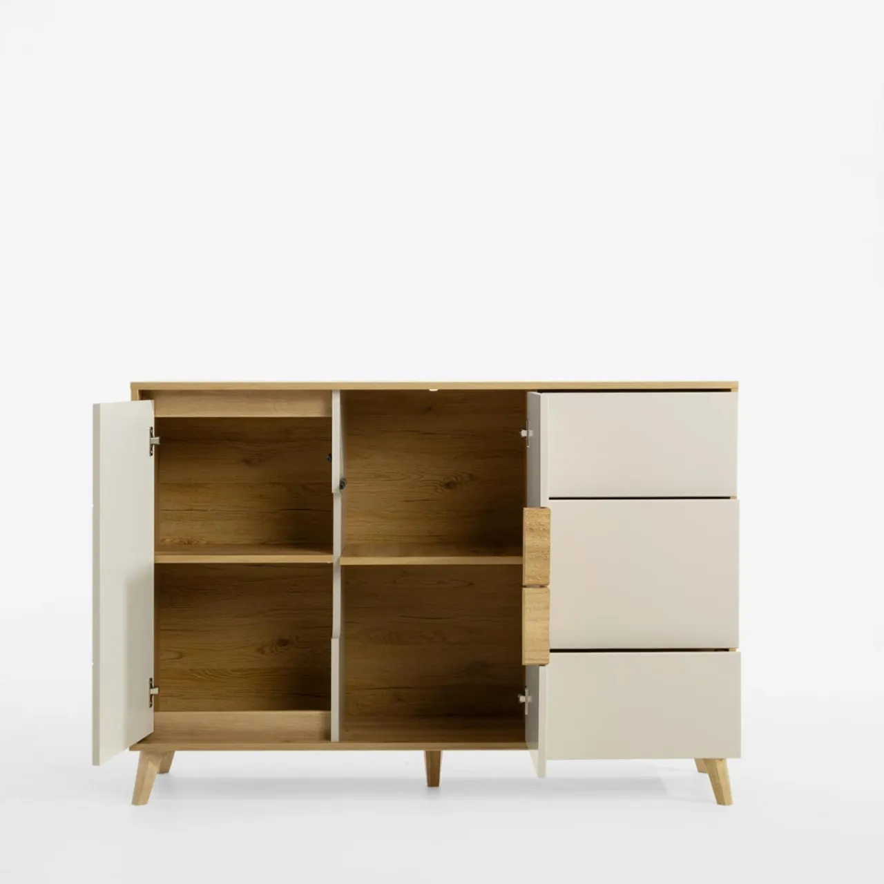 - Komoda ma 4 wnęki ukryte za pełnymi drzwiami.