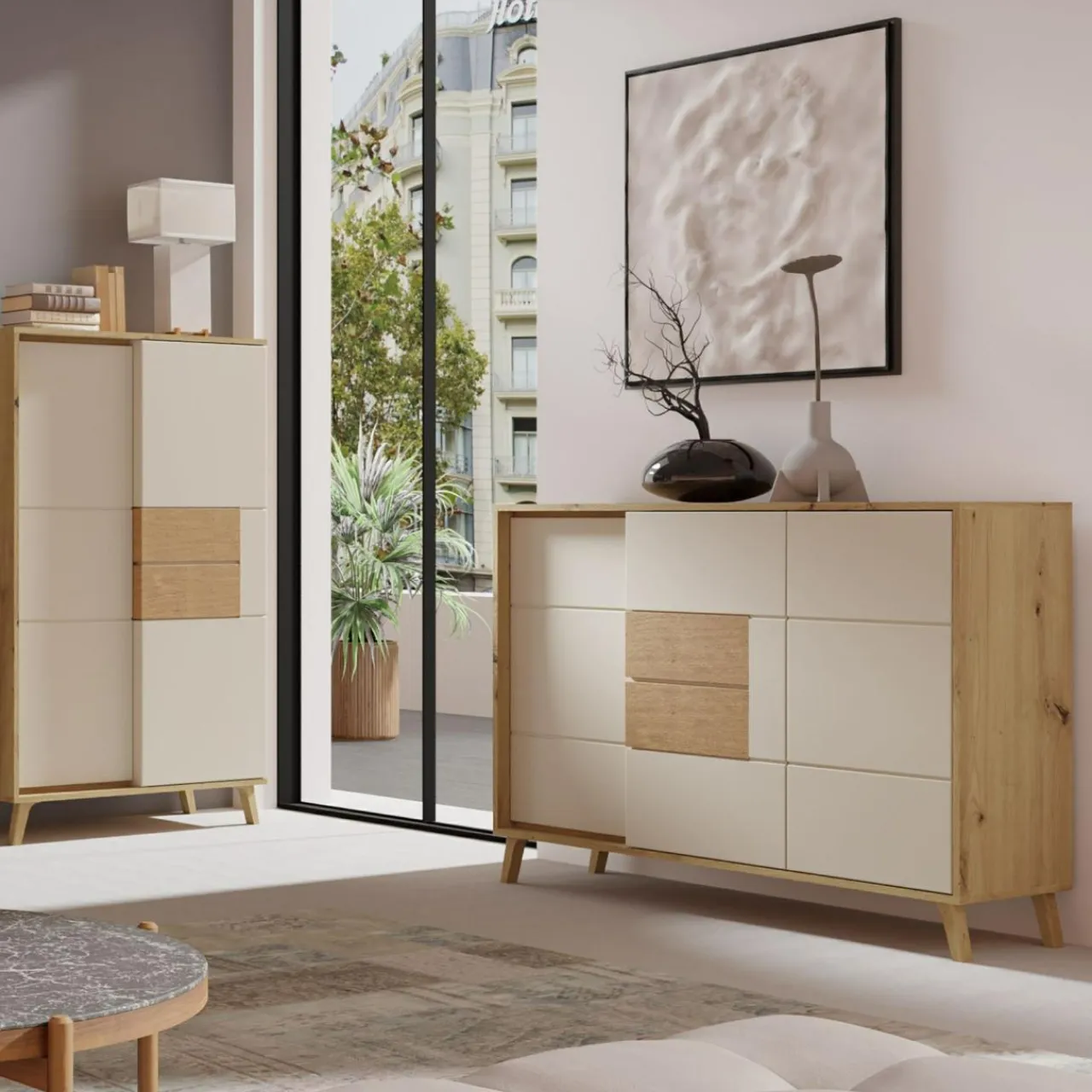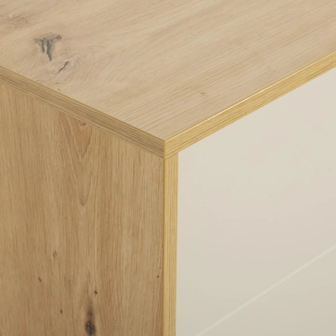 Beżowe bryły rozjaśnią wnętrze, a fronty ze wstawkami z prawdziwego drewna w kolorze dąb artisan nadadzą naturalnego akcentu.